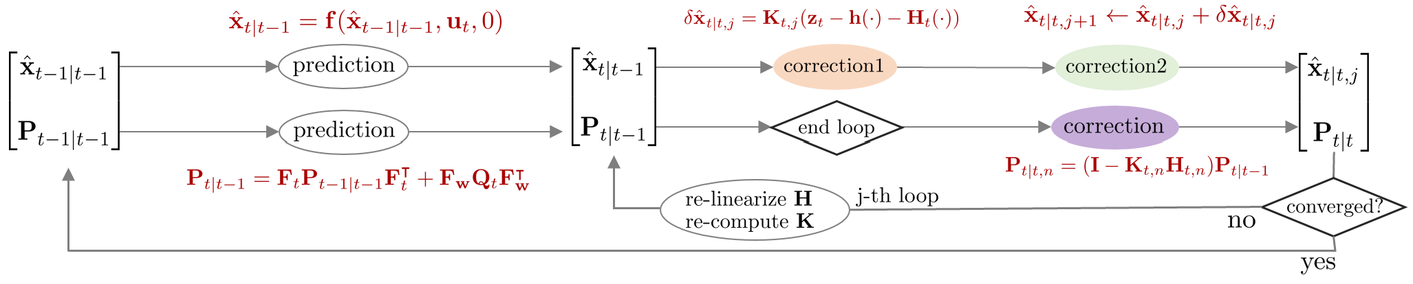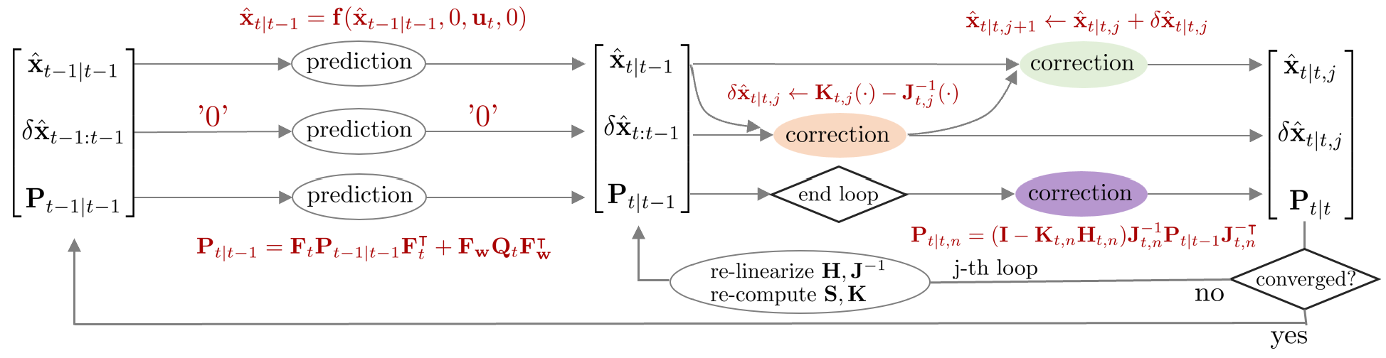 & {\color{Mahogany} \quad \delta \hat{\mathbf{x}}_{t|t,j} = \mathbf{K}_{t,j} \bigg( \mathbf{z}_{t} - \mathbf{h}(\hat{\mathbf{x}}_{t|t,j}, 0 ,0) + \mathbf{H}_{t,j}\mathbf{J}^{-1}_{t,j}(\hat{\mathbf{x}}_{t|t,j} - \hat{\mathbf{x}}_{t|t-1}) \bigg) - \mathbf{J}^{-1}_{t,j}(\hat{\mathbf{x}}_{t|t,j} - \hat{\mathbf{x}}_{t|t-1}) } \\
