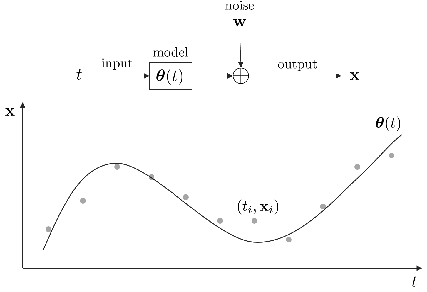 추정 문제의 목적은 주어진 데이터 $(t_i, \mathbf{x}_i)$를 사용하여 최적의 모델 $\boldsymbol{\theta}(t)$를 찾는 것이다. 이 때, 어느 시점을 추정하느냐에 따라 다른 추정 문제가 된다.