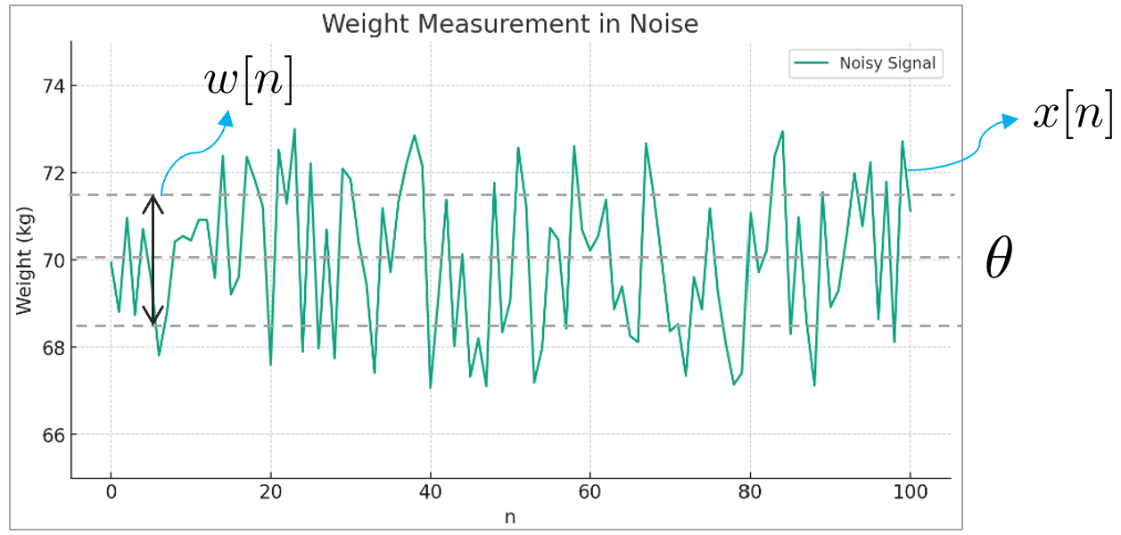 예를 들어 위 그림과 같이 평균 몸무게가 70kg인 사람을 1년 동안 측정한 데이터가 주어졌다고 가정하자. 그래프를 이루고 있는 초록색 데이터들은 $x[n]$이며 데이터들의 중심값은 추정하고자 하는 파라미터 $\theta$가 된다. 그리고 $\theta$로부터 위 아래로 벌어진 정도(=분산)는 $w[n]$ 을 통해 수학적으로 표현할 수 있다.