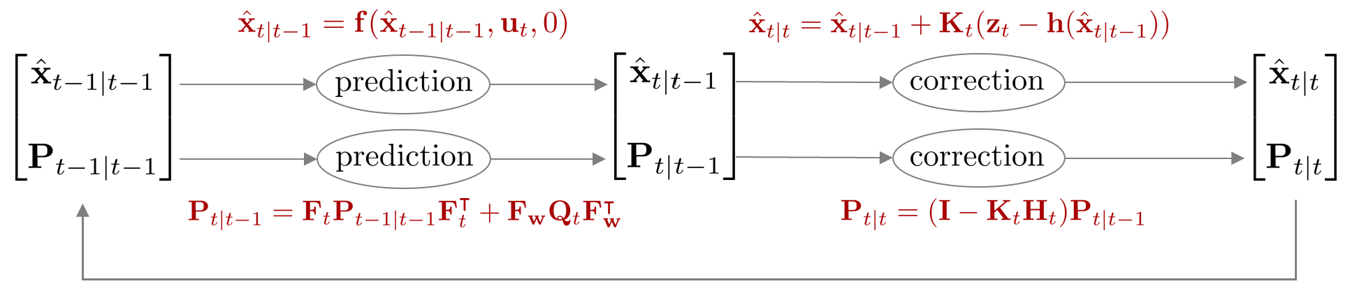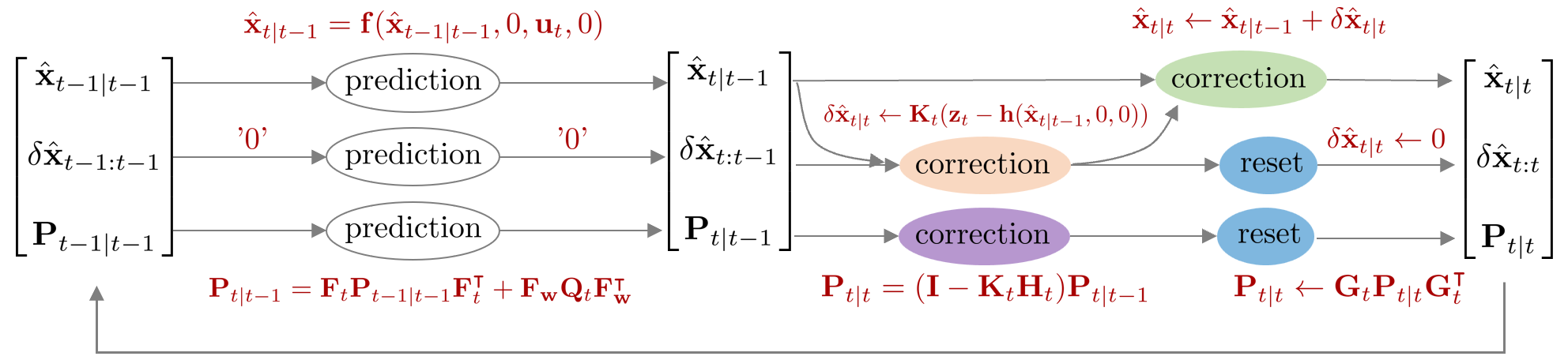 - $\overline{\text{bel}}( \delta \mathbf{x}_{t}) \sim \mathcal{N}( \delta \hat{\mathbf{x}}_{t|t-1}, \mathbf{P}_{t|t-1})$