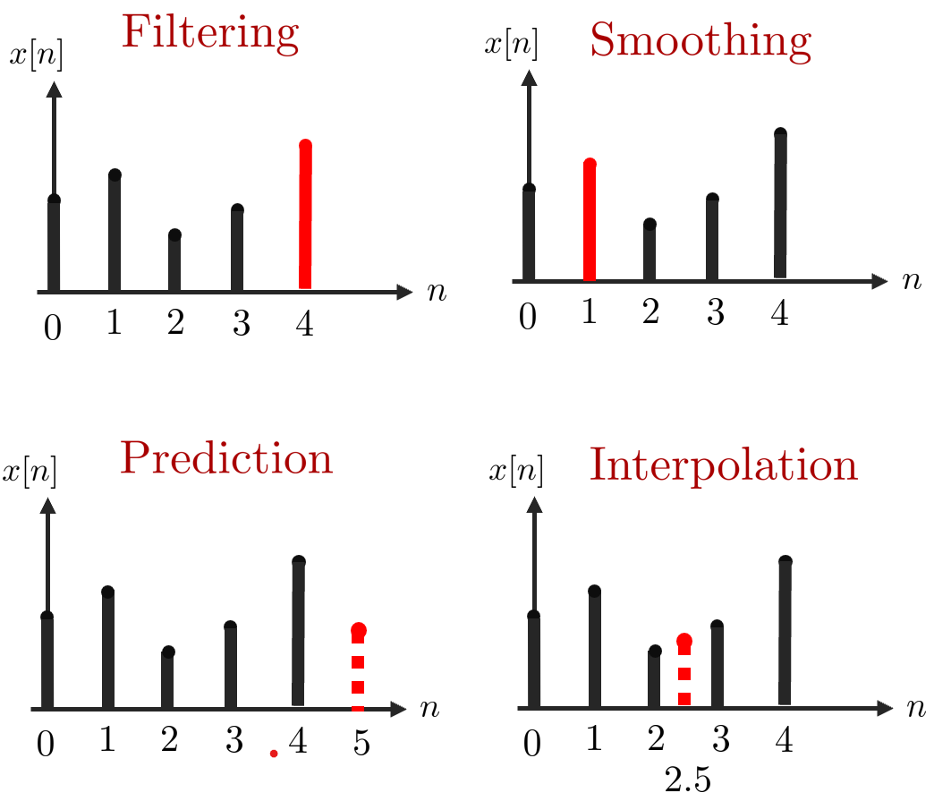 - Interpolation: 보간은 관측 데이터 $\{x[0], \cdots ,x[n-1], x[n+1,\cdots,x[N-1]\}$이 주어졌을 떄 $\theta=x[n]$을 추정하는 경우를 말한다.