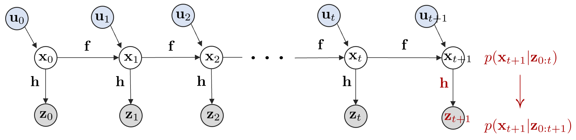 동적 시스템은 일반적으로 상태 예측(prediction) 단계와 업데이트(update, 또는 correction) 단계로 나뉜다. 예측 단계는 다음과 같이 현재까지 측정한 모든 관측값 $\mathbf{z}_{0:t}$과 현재 상태 $\mathbf{x}_{t}$를 통해 다음 상태 $\mathbf{x}_{t+1}$를 예측하는 것을 말한다.
