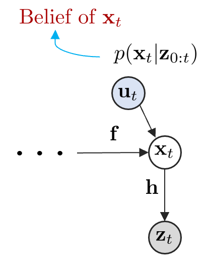 \text{bel}(\mathbf{x}_{t}) = p(\mathbf{x}_{t} \ | \ \mathbf{z}_{1:t}, \mathbf{u}_{1:t})