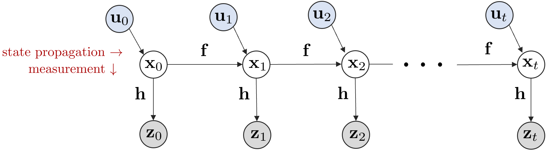 & \text{Motion Model: } & \mathbf{x}_{t} = \mathbf{f}(\mathbf{x}_{t-1}, \mathbf{u}_{t} ) + \mathbf{w}_{t} \\
