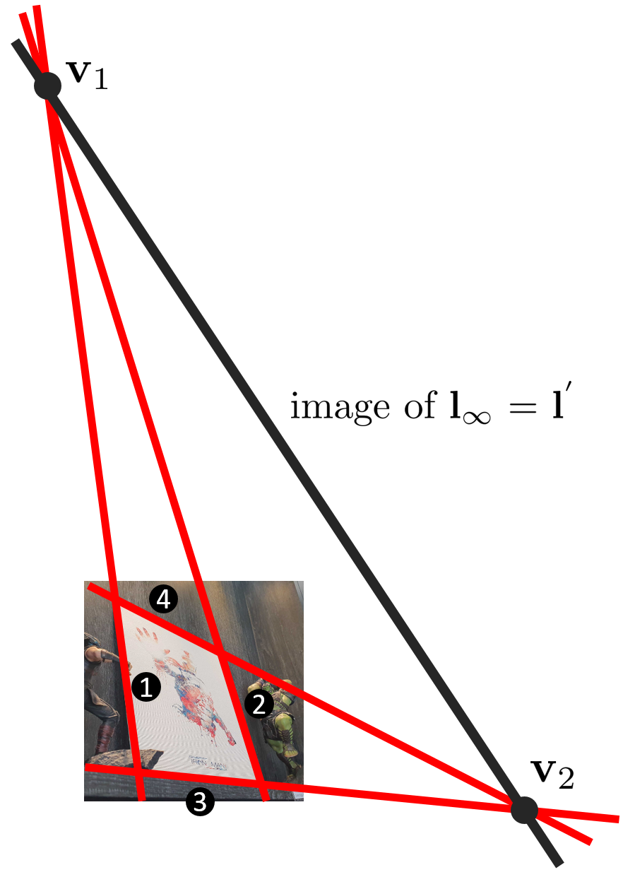 3. $\mathbf{v}_{1}$, $\mathbf{v}_{2}$를 잇는 image of line at infinity $\mathbf{l}^{'} = [a,b,c]^{\intercal}$를 구한다.