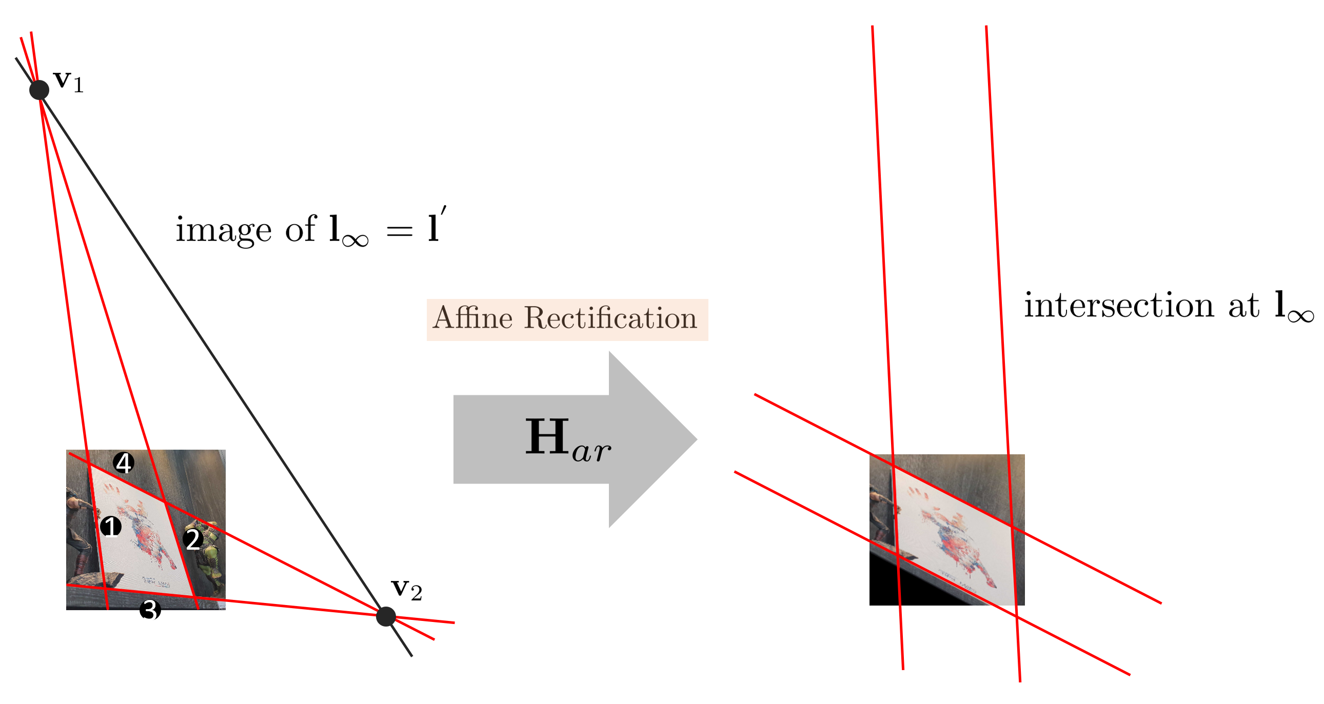 최종적으로 원본 이미지에 $\mathbf{H}_{ar}$를 적용하면 affine rectification된 이미지를 얻을 수 있다.