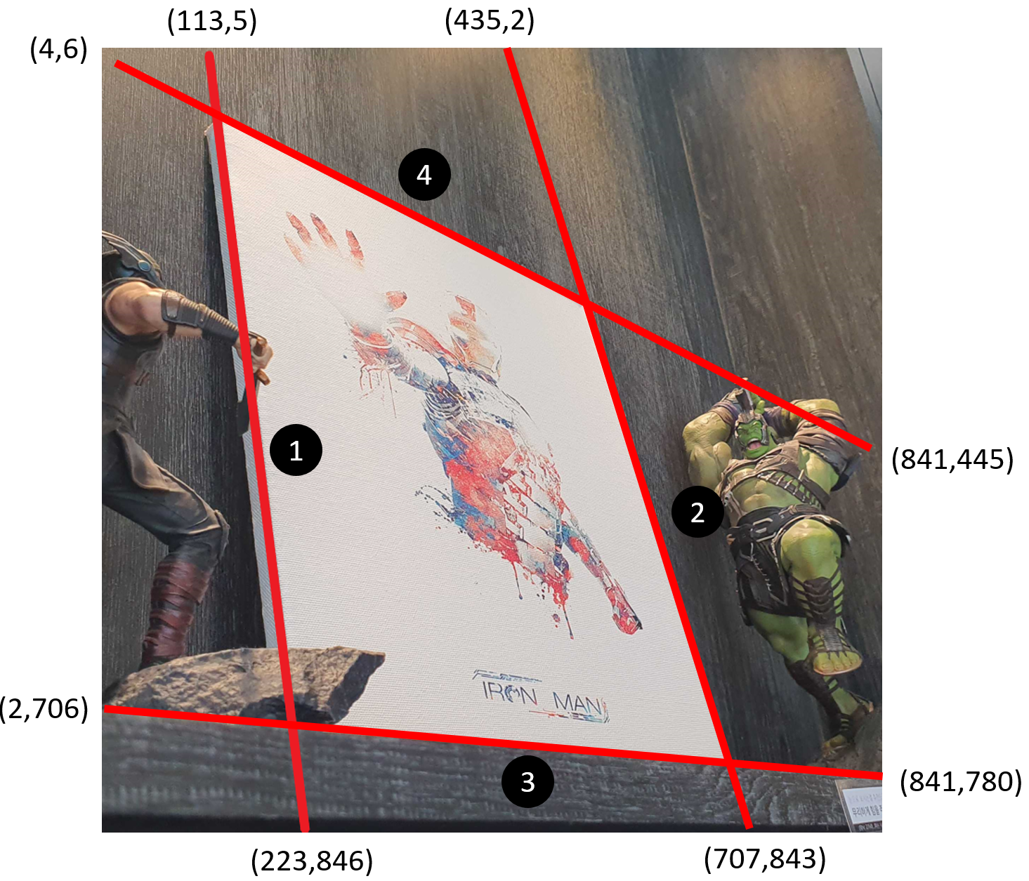 우선, 임의의 직사각형 물체를 촬영한 후 복원하고자하는 직선의 선분들의 픽셀 위치를 알아야 한다. 이 때, 직선들을 1,2,3,4 순서대로 코드에 잘 입력하는 것이 중요한데 헷갈리지 않기 위해 그림판 도구로 각 선분에 직선을 미리 그려본 후 각 직선의 픽셀 위치를 알아낸다. 예제 사진에서는 카메라의 렌즈로 인한 왜곡(lens distortion)은 무시한다.