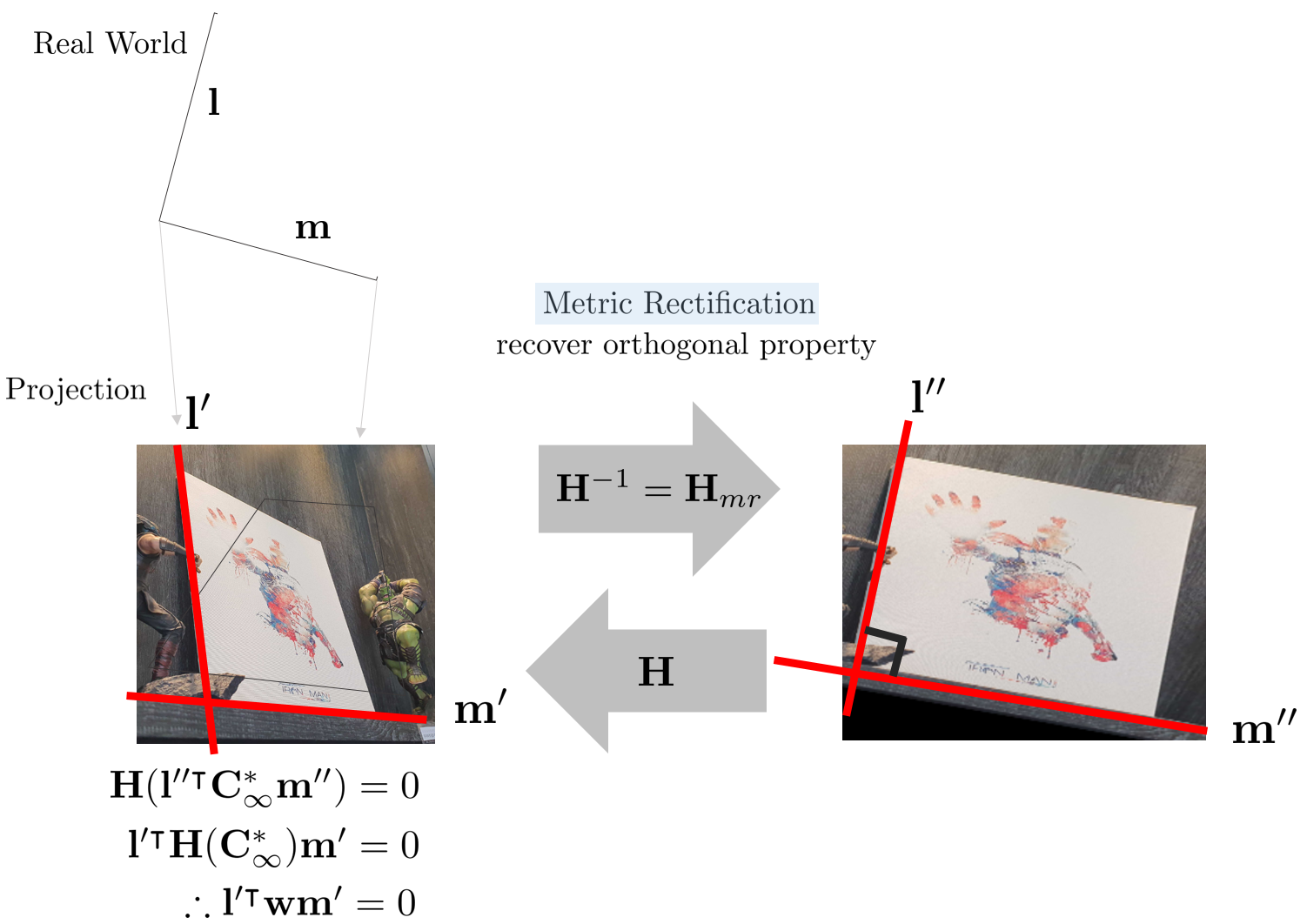 앞서 언급한 내용과 같이 $\mathbf{H}$에 의한 image of absolute dual conic은 $\mathbf{w} = \begin{bmatrix} \mathbf{KK}^{\intercal} & 0 \\ 0 & 0 \end{bmatrix}$로 나타낼 수 있다. 따라서 위 그림에서 $\mathbf{l}''$, $\mathbf{m}''$에 homography 변환 $\mathbf{H}$를 적용한 결과는 다음과 같이 나타낼 수 있다.