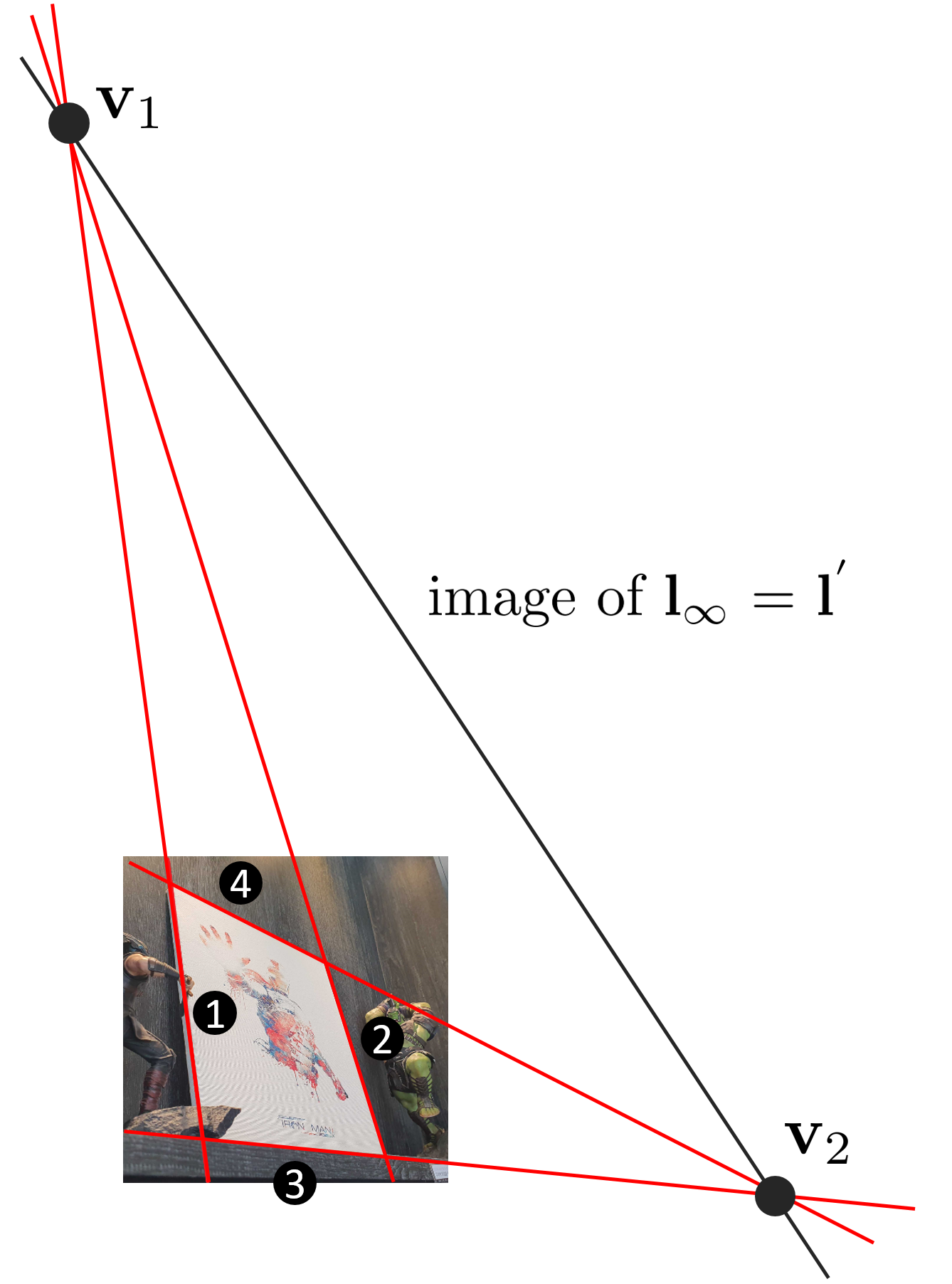 다음으로 소실점 $\mathbf{v}_{1}, \mathbf{v}_{2}$를 찾아야 한다. 1,2번 직선과 3,4번 직선은 각각 서로 평행하므로 두 직선의 교점이 line at infinity $\mathbf{l}_{\infty}$에서 만나야하지만 projective 변환된 이미지의 경우 두 직선들의 교점은 이미지 평면 상에서 만난다.