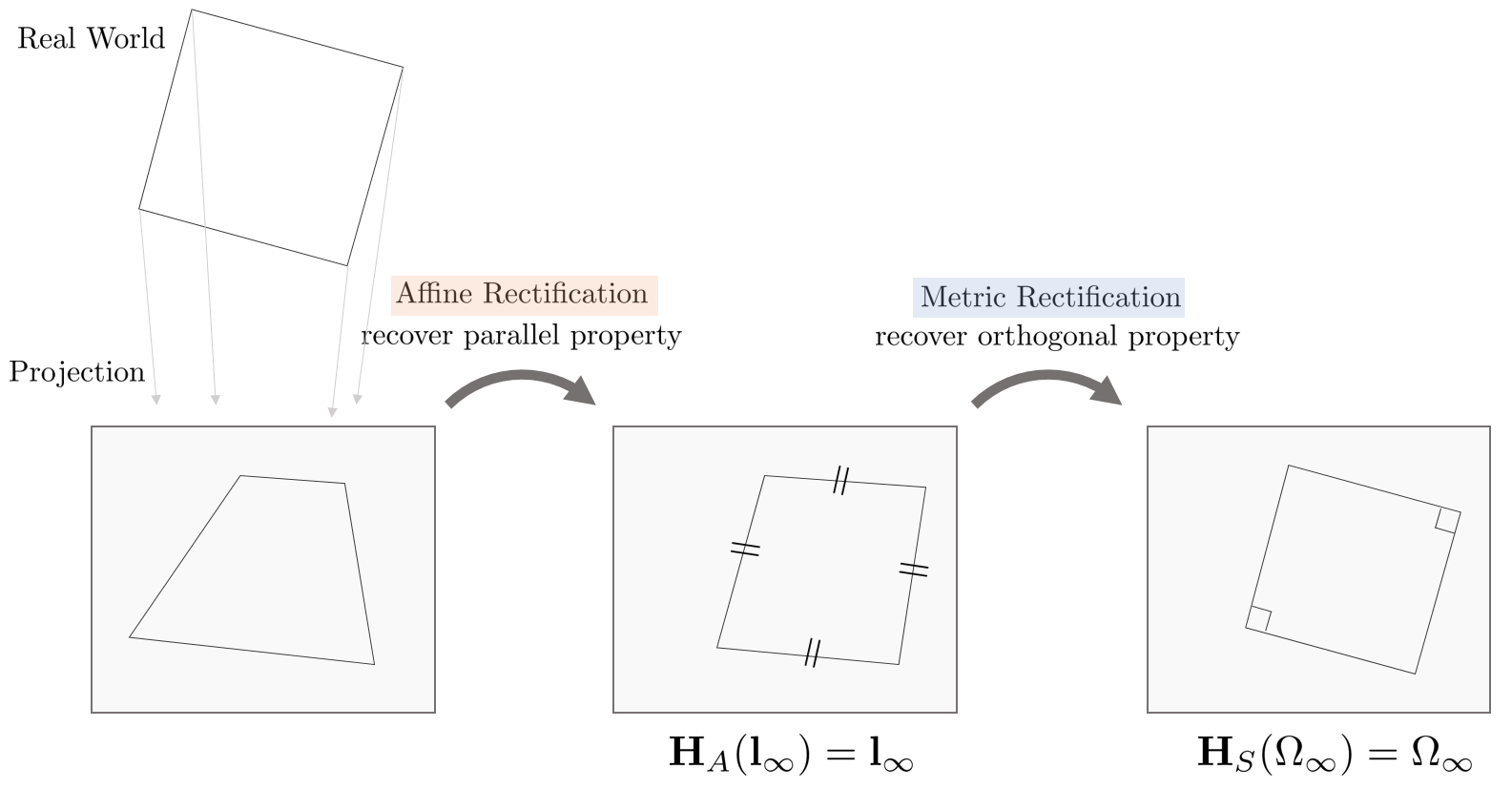 일반적으로 현실에 존재하는 물체를 이미지 평면 상에 프로젝션(촬영)하는 경우 직선의 성질만 보존될 뿐 평행한 성분과 직각인 성분들의 특징은 보존되지 않는다. 이는 projective 변환의 특징이다. affine & metric rectification은 이러한 임의의 이미지가 주어졌을 때 이미지 상에서 평행한 선들과 직교한 선들을 사용하여 affine 성질과 metric 성질을 복원하는 것을 의미한다. affine rectification을 수행하면 평행한 선들의 특징을 복원할 수 있고 metric rectification을 수행하면 서로 직각인 직선들의 특징을 복원할 수 있다.