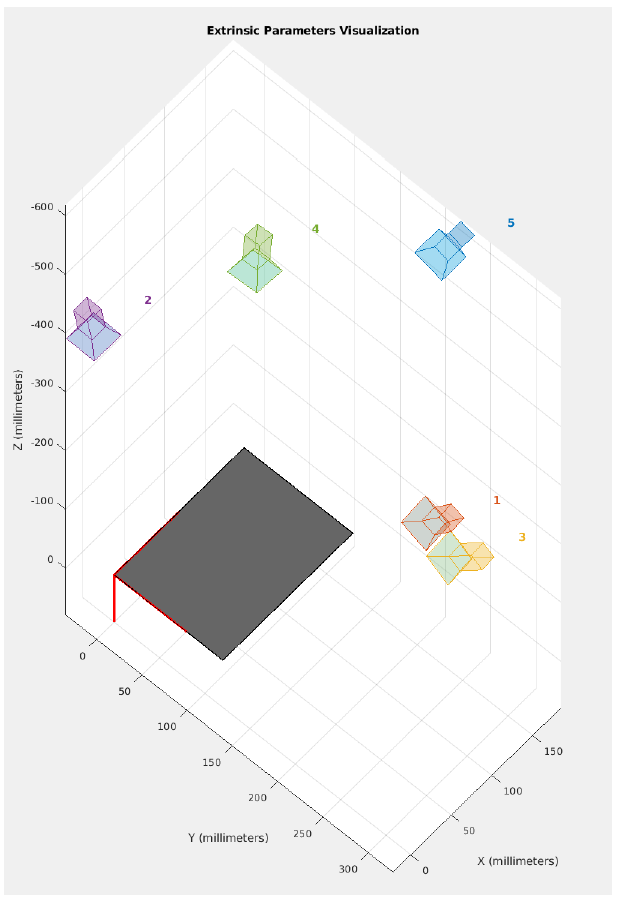 $$\mathbf{R}_{5,mat} = \begin{bmatrix} 0.986 & -0.051 & 0.155 \\ -0.005 & 0.937 & 0.347 \\ -0.163 & -0.343 & 0.924 \end{bmatrix}, \mathbf{t}_{5,mat} = \begin{bmatrix} -67.523 \\ 2.961 \\ 658.088 \end{bmatrix}$$