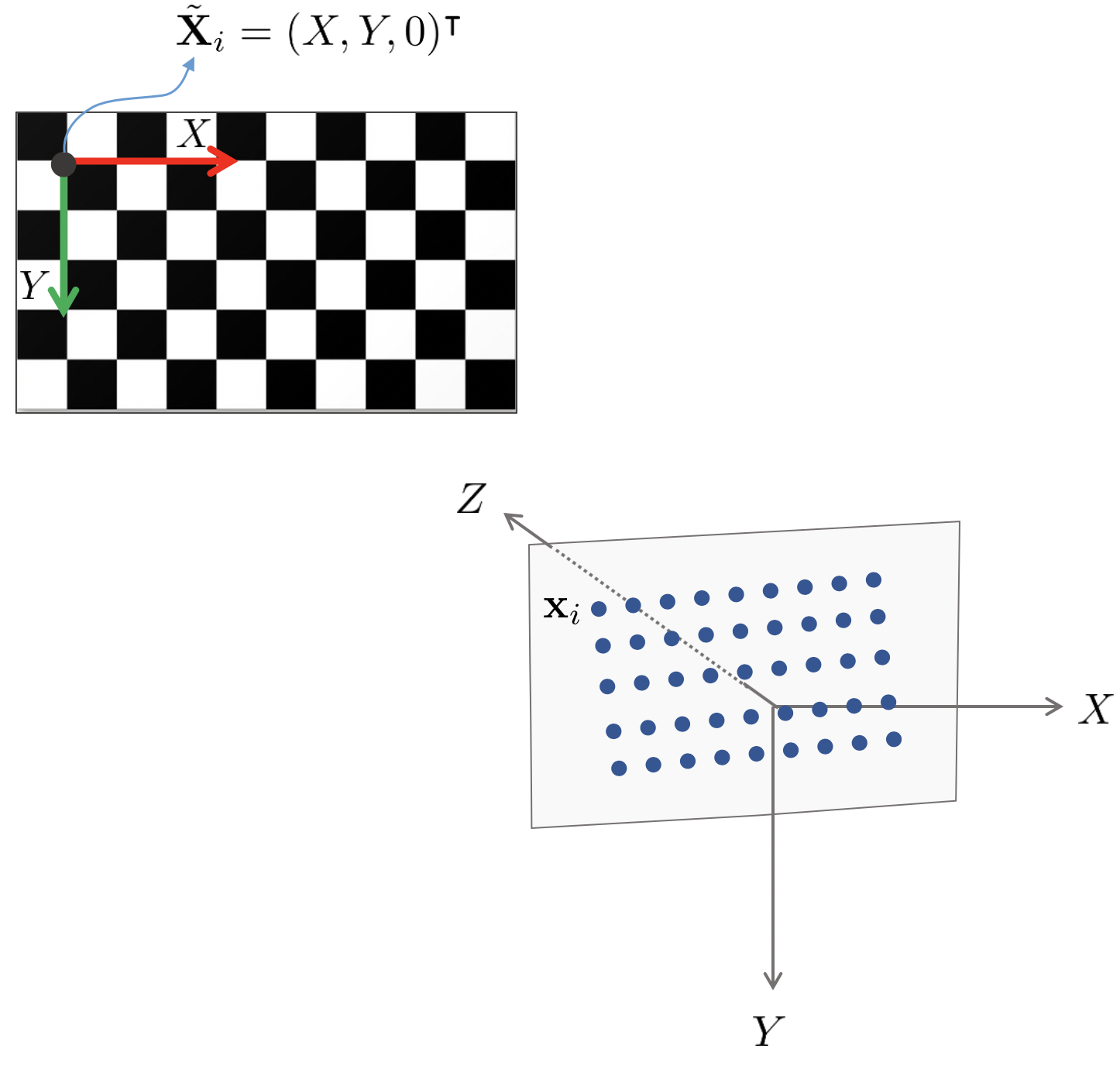 이에 따라 체커보드 평면 $\pi_{0}$위의 임의의 점 $\mathbf{X}_{i}$들은 $Z=0$인 점이 된다.