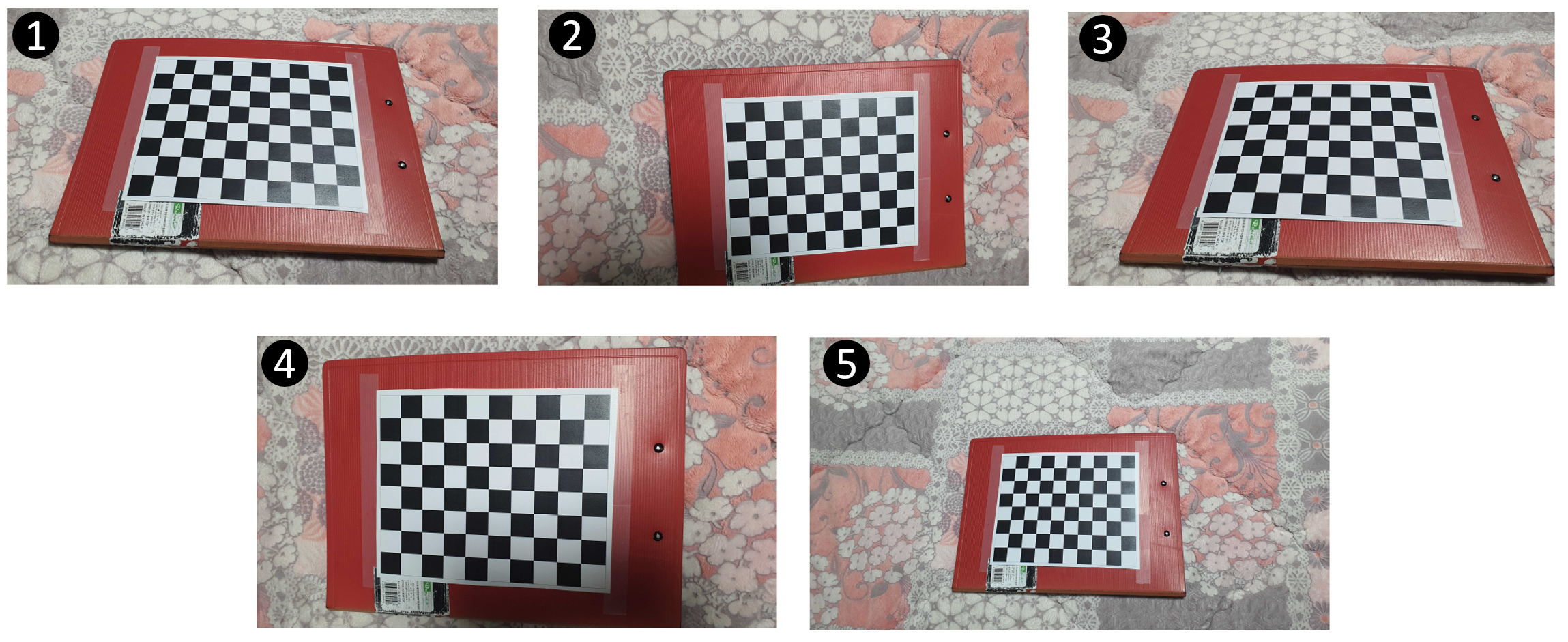 20mm 간격으로 구성된 7x9 체커보드를 인쇄하여 평평한 보드에 붙인 후 다양한 각도에서 촬영한 5장의 사진을 준비한다. 간단한 예제 구현을 위해 촬영에 사용된 카메라의 lens distortion은 없다고 가정한다.