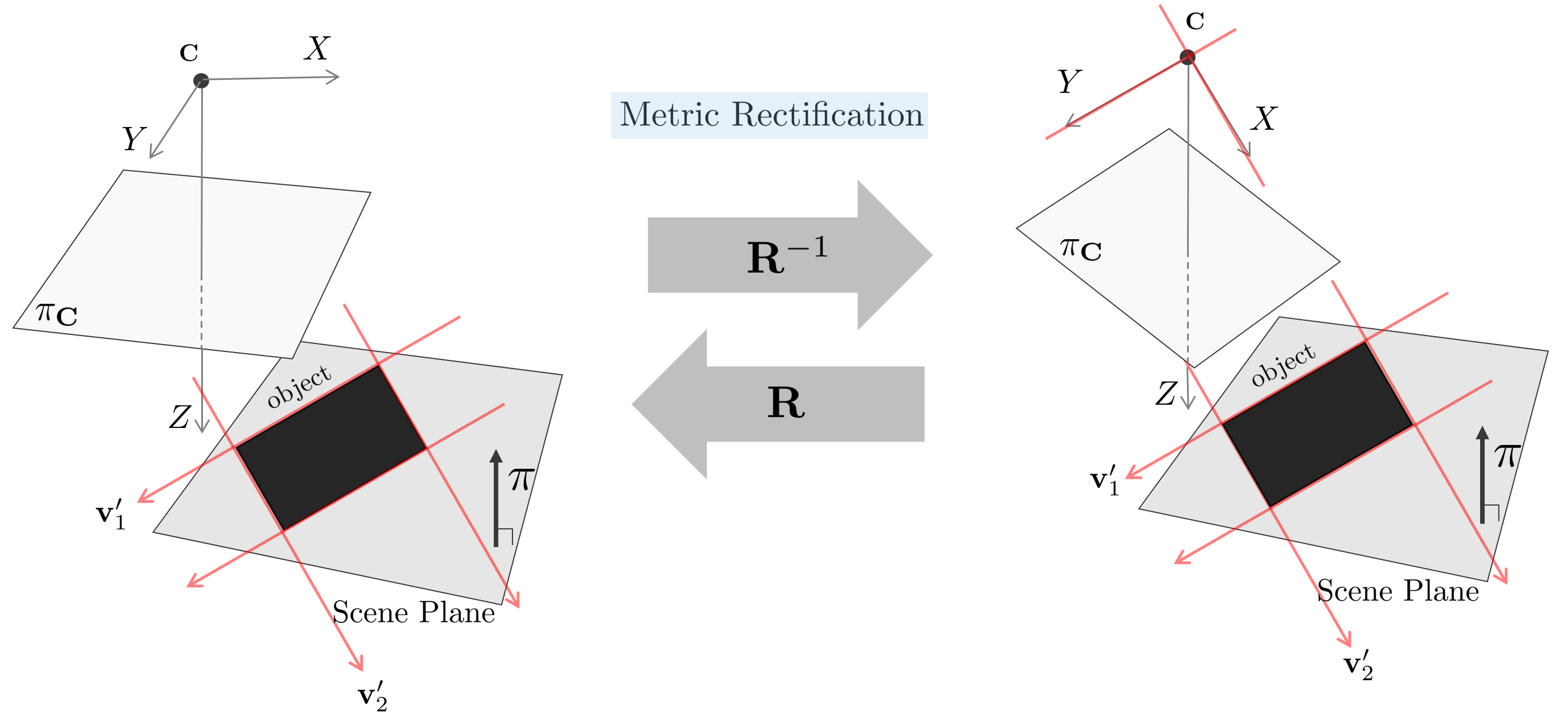 affine rectification까지 진행된 경우 카메라의 주축 $Z$은 scene plane 평면 $\pi$의 법선벡터와 평행하게 된다. 다음으로 affine rectification이 적용된 소실점 $\mathbf{v}'_{1}, \mathbf{v}'_{2}$와 카메라의 $X,Y$축을 평행하도록 하는 rotation matrix $\mathbf{R}^{-1}$를 구함으로써 metric rectification을 수행할 수 있다. 이 때, $\mathbf{v}'_{1} = [v_{1x}, v_{1y}, 0]^{\intercal}, \mathbf{v}'_{2} = [v_{2x}, v_{2y}, 0]^{\intercal}$을 의미하므로 이는 평행인 직선들의 방향벡터가 된다.