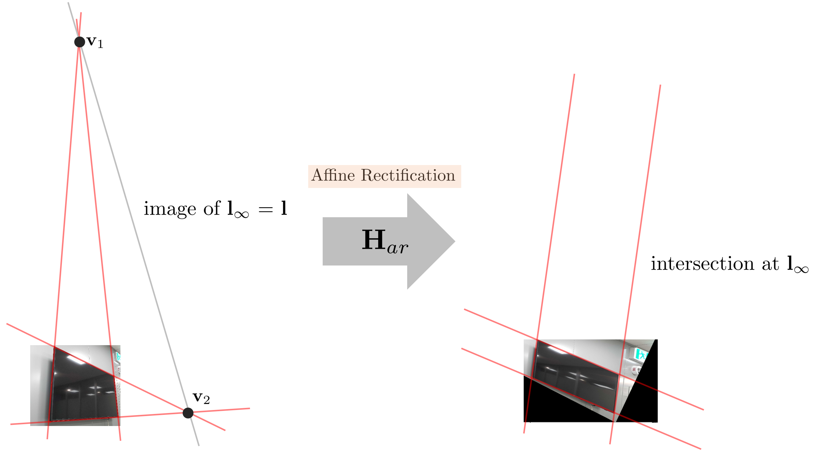 직사각형 물체의 네 꼭지점 좌표를 알고 있다고 가정하면 이를 통해 소실점(vanishing point) $\mathbf{v}_{1},\mathbf{v}_{2}$과 소실선(vanishing line) $\mathbf{l}$을 구한다. 앞서 포스팅에서 설명한 내용과 동일하게 소실선 $\mathbf{l}$은 무한대 직선의 이미지 (image of line at infinity)이므로 이를 다시 무한대 직선 $\mathbf{l}_{\infty}$으로 보내주는 affine rectification 행렬 $\mathbf{H}_{ar}$을 구해야 한다. $\mathbf{H}_{ar}$을 구하는 자세한 내용은 위 포스팅에 설명되어 있으므로 본 포스트에서는 생략한다.