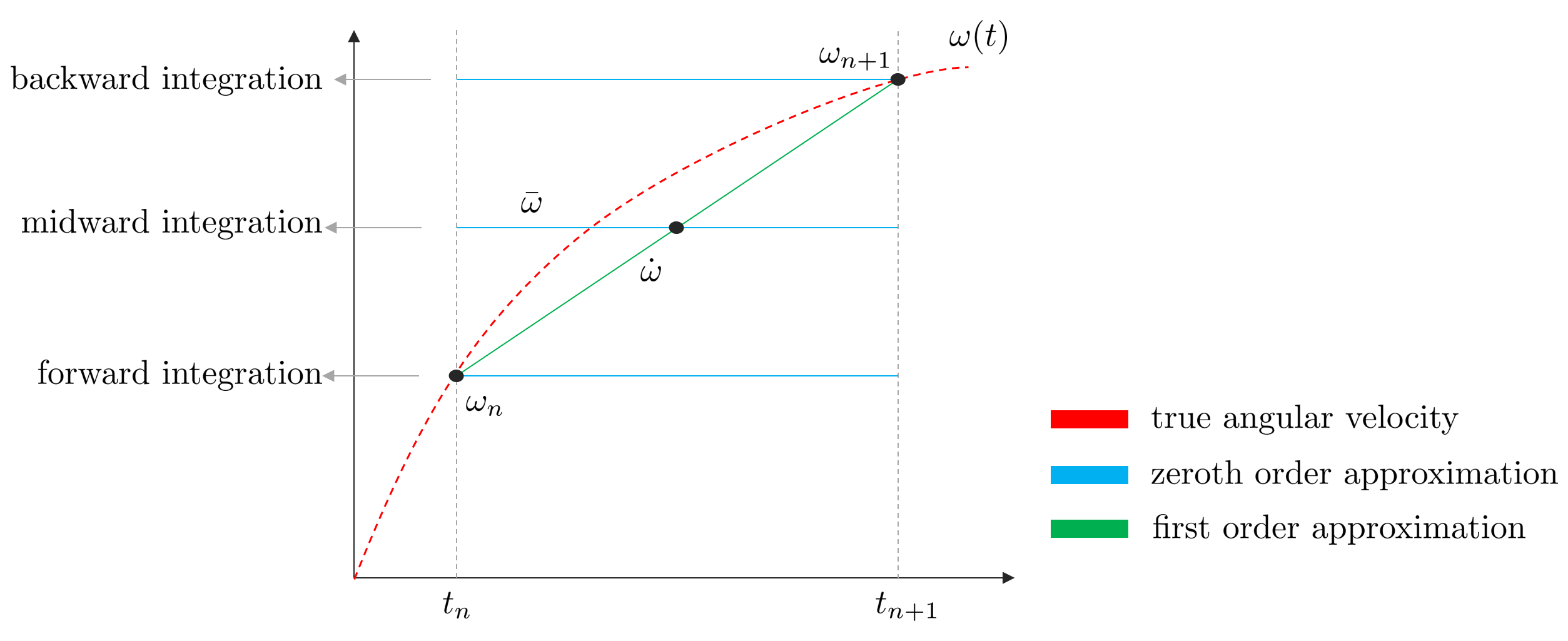 Midward integration 각속도 $\boldsymbol{\omega}$를 처음과 끝의 중간으로 설정하여 적분하는 방법이다.