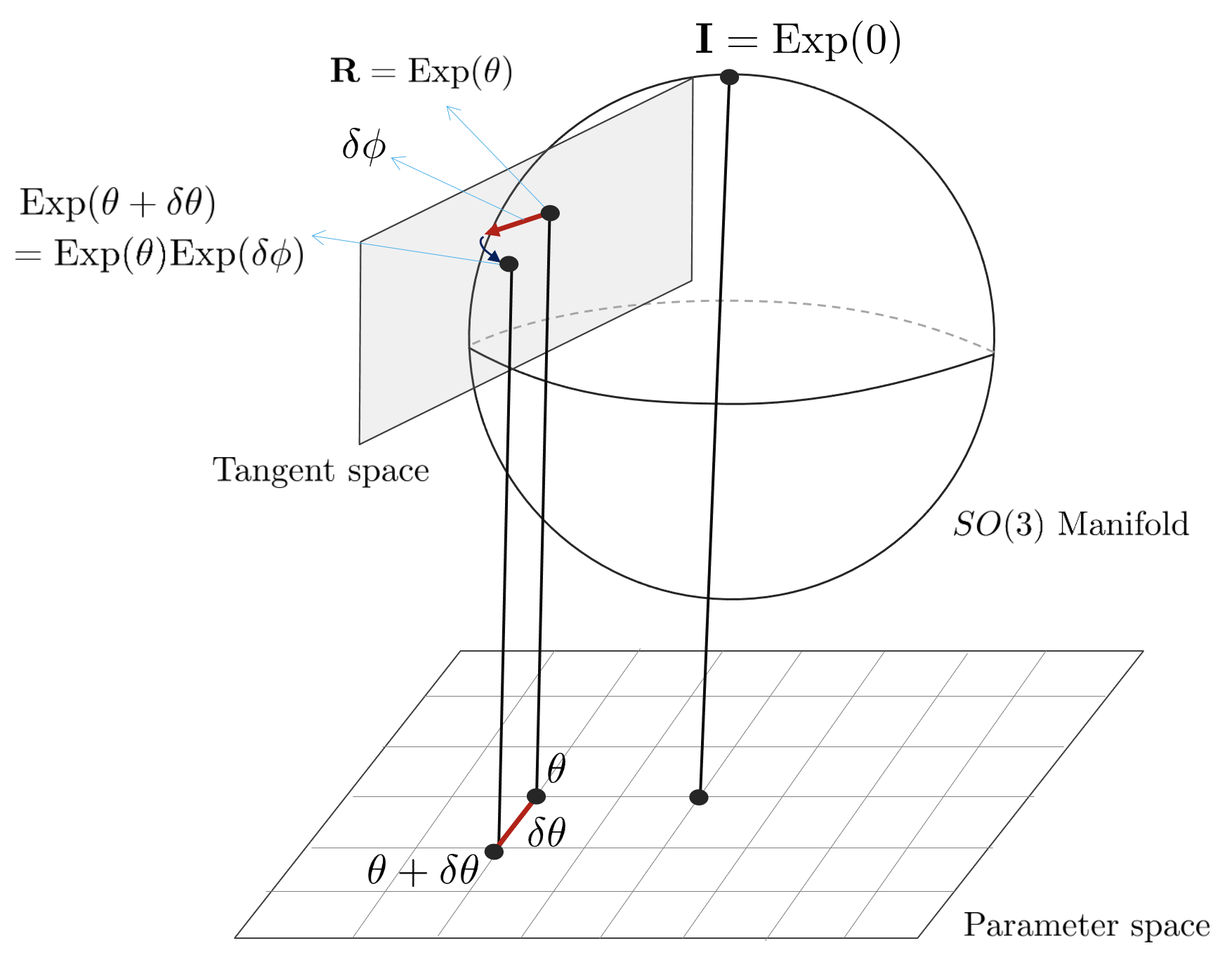 함수 $f : \mathbb{R}^{m} \rightarrow SO(3)$에 주어졌을 때, 함수의 perturbations는 $+$ 연산자를 사용하고 SO(3) 차이는 $\ominus$를 사용하여 표현할 수 있다.