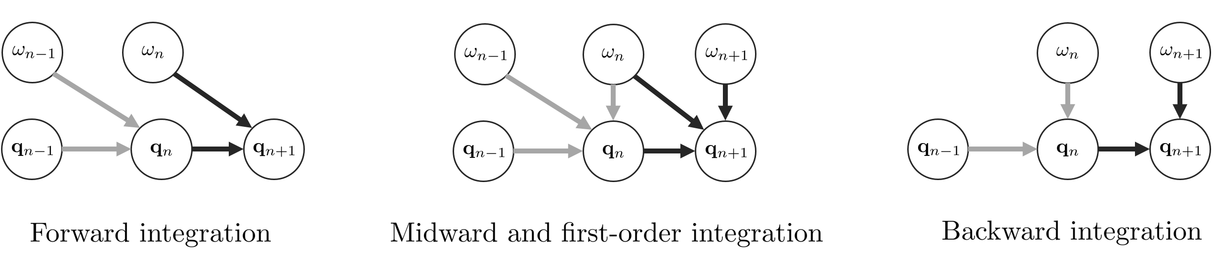 Backward integration $\Delta t$의 맨 마지막 구간 $t_{n+1}$의 각속도인 $\boldsymbol{\omega}_{n+1}$을 사용하여 적분하는 방법이다. 이는 $t_{n+1}$에서 $\mathbf{q}_{n}$의 테일러 급수를 전개하는 것과 유사하다.