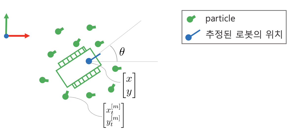 파티클 필터는 SLAM Initialization 과정에서 초기 포즈 설정이 어려운 문제를 어느 정도 해결할 수 있다. 각 그림의 의미는 다음과 같다.
