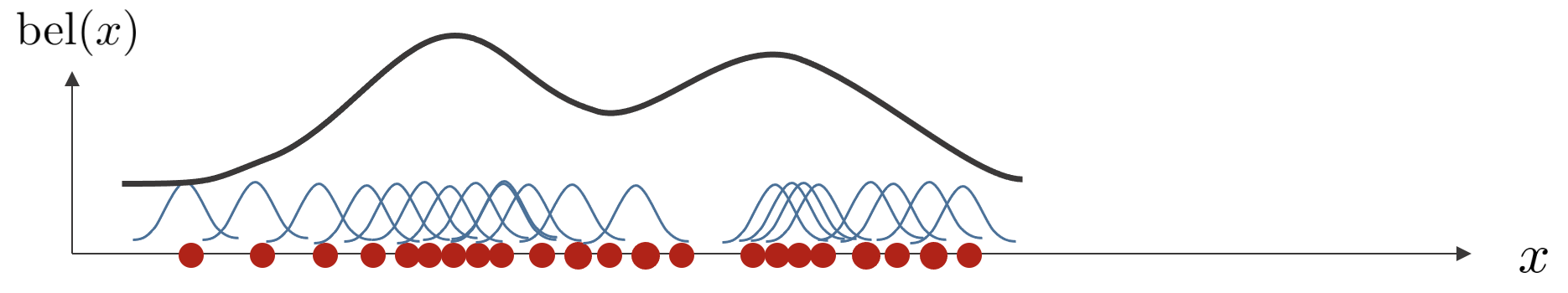 각각 파티클마다 특정 분포 (e.g., 가우시안)을 갖는다고 가정한 후 모든 분포의 합을 더하여 로봇의 위치를 구하는 방법