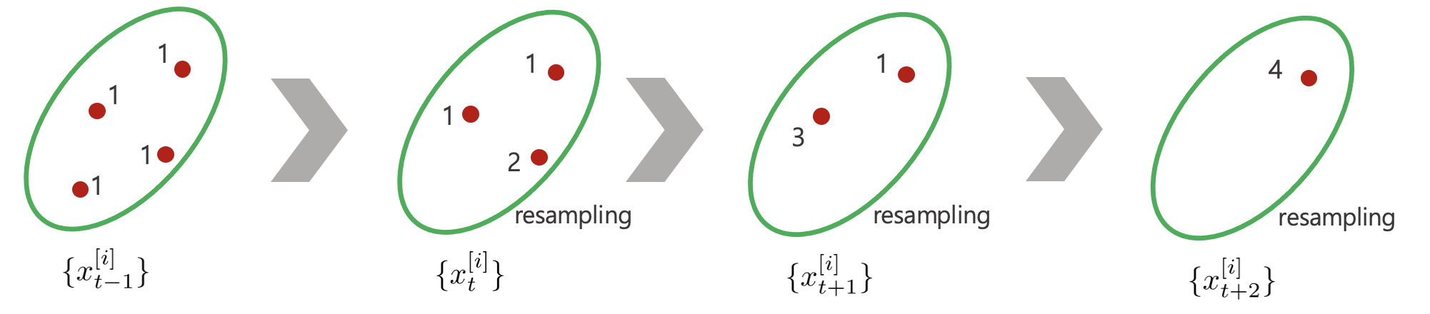 6. 최종적으로 $\bar{x}_{t}^{[1]}$ 위치에 중복된 점 2개, $\bar{x}_{t}^{[3]}$ 위치에 점 1개가 리샘플링된다.