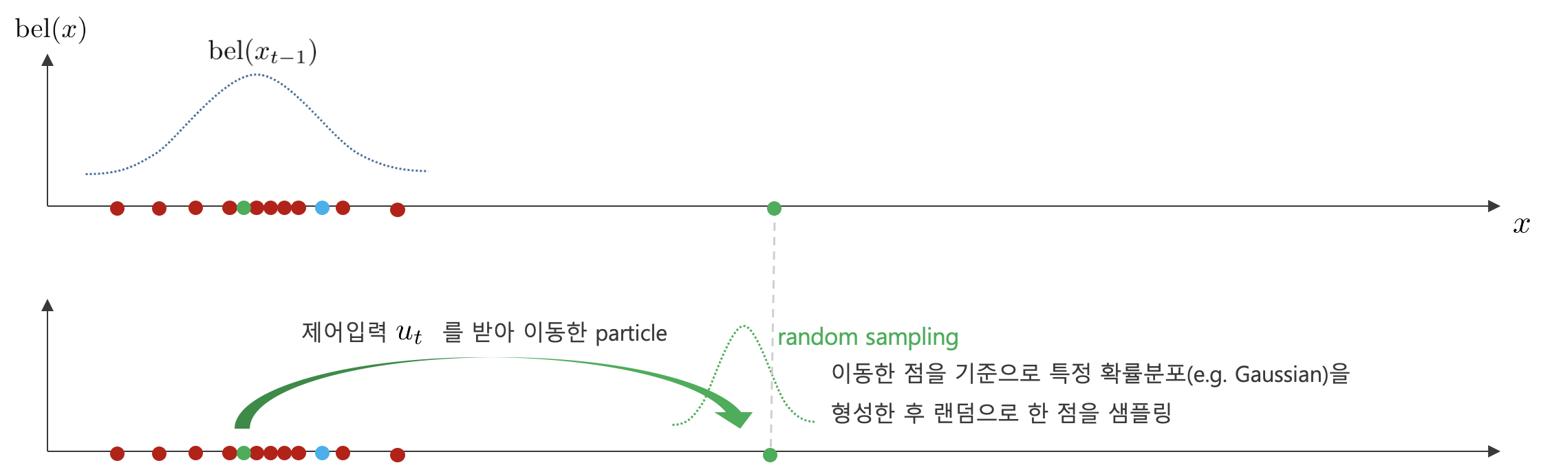 1. 다음과 같이 $t-1$ 스텝에서 로봇의 위치를 추정하고 있을 때 제어 입력 $u_{t}$가 들어온다고 가정하자. 특정 한 점이 제어 입력 $u_{t}$만큼 이동한 후 가우시안 분포를 생성하여 한 점을 다시 랜덤 샘플링한다.
