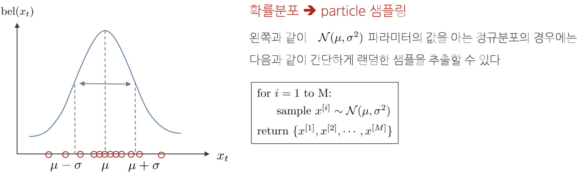 확률분포와 파티클 사이의 변환은 여러 가정 하에 다음과 같이 수행할 수 있다. 우선 주어진 확률분포로부터 파티클은 다음과 같이 샘플링할 수 있다.