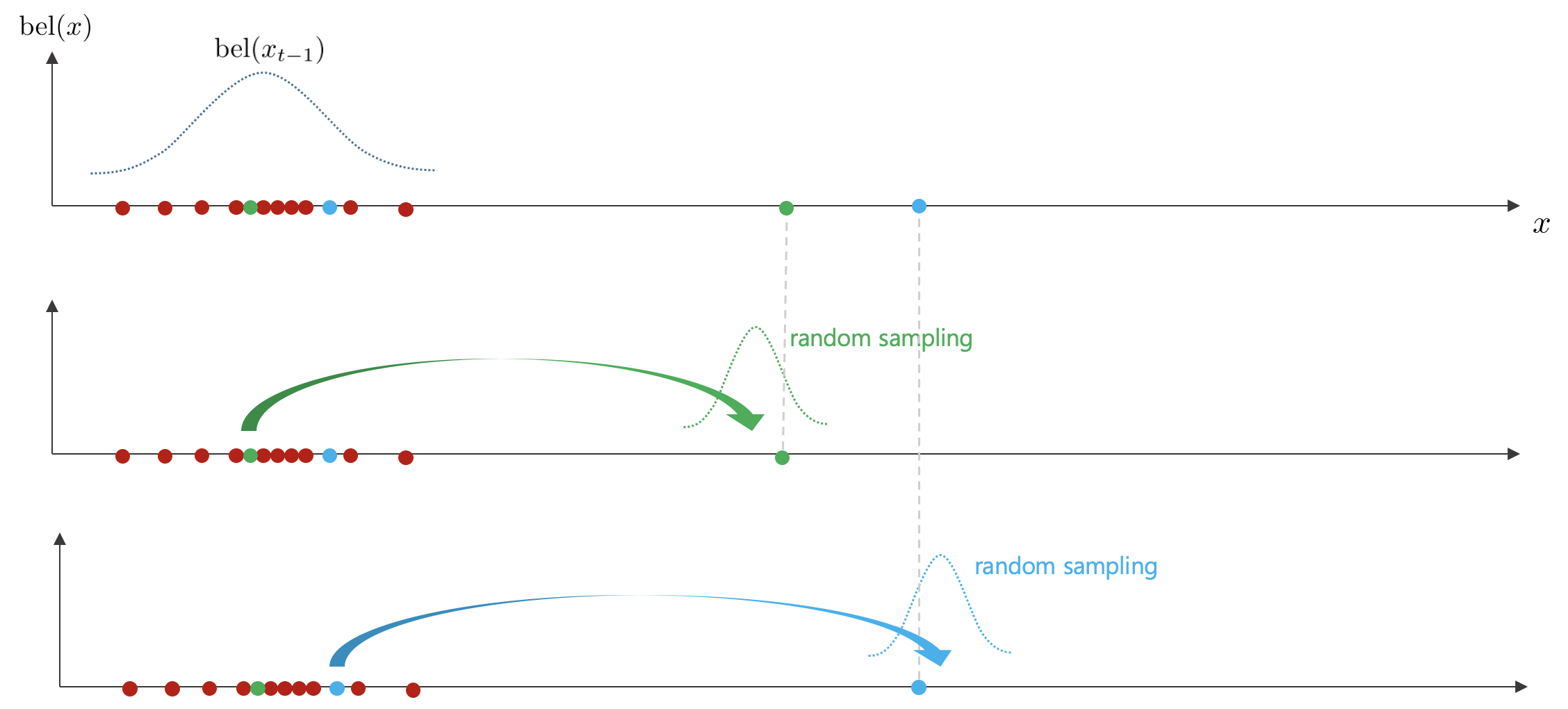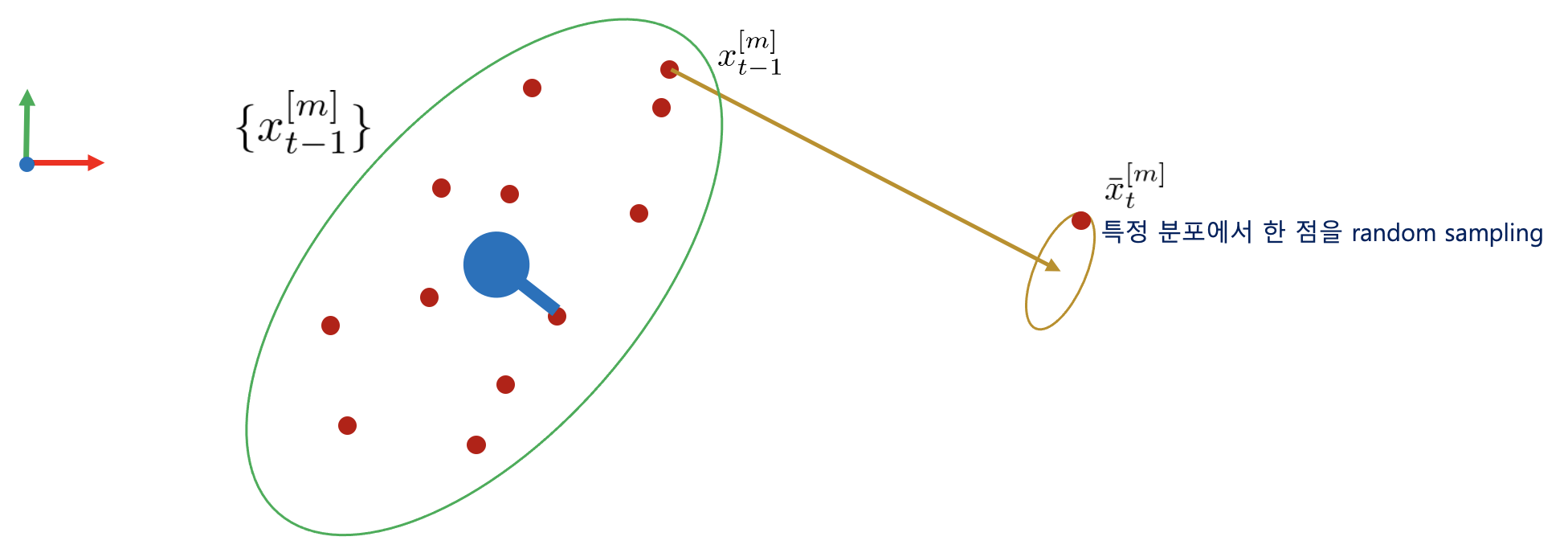 1. $t-1$ 스텝에서 다음과 같이 파티클들이 분포해 있다고 가정하자.