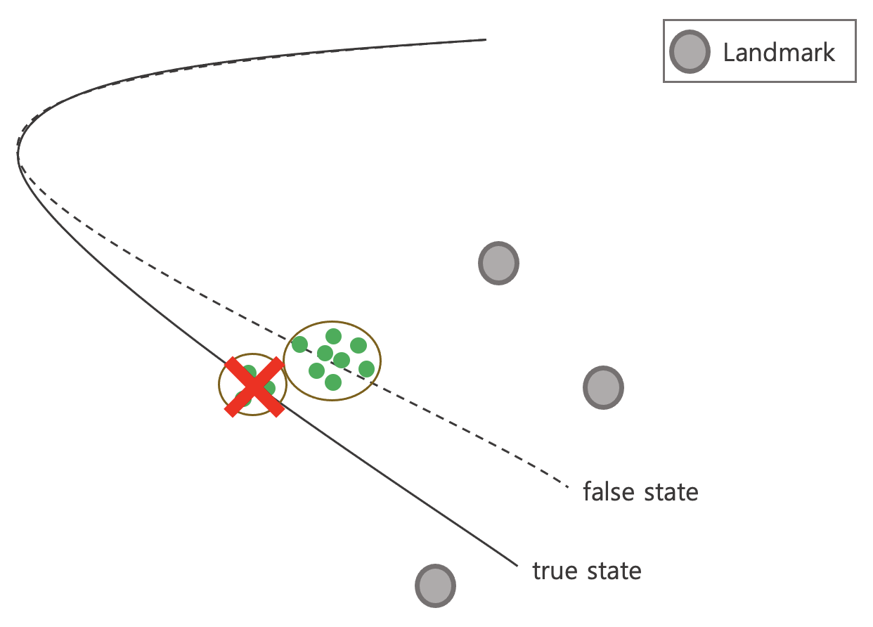 다음과 같이 true state의 파티클들이 리샘플링으로 전부 사라질(wipe out) 가능성이 존재한다.