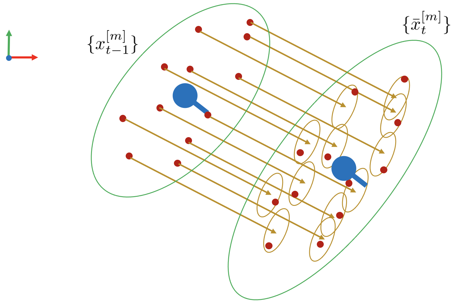 4. 이와 같은 방법으로 모든 파티클들을 예측하여 predicted paritcle $\bar{x}_{t}^{[m]}$를 생성한다.