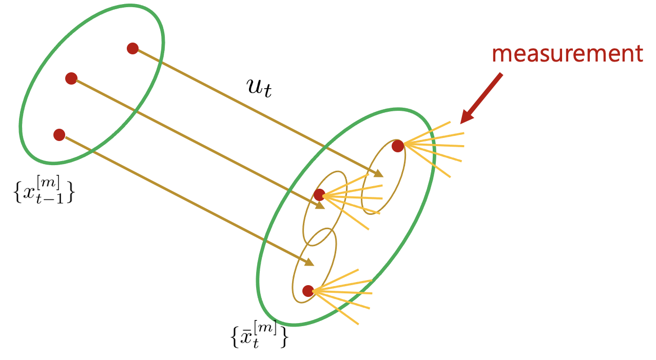 위 식은 $t-1$ 스텝에서 m번째 파티클이 제어 입력 $u_{t}$를 받아 이동한 후 이동한 점을 기준으로 특정 확률 분포를 형성하는데 해당 확률분포에서 랜덤으로 하나를 샘플링한 파티클을 predicted particle $\bar{x}_{t}^{[m]}$로 정의한다.