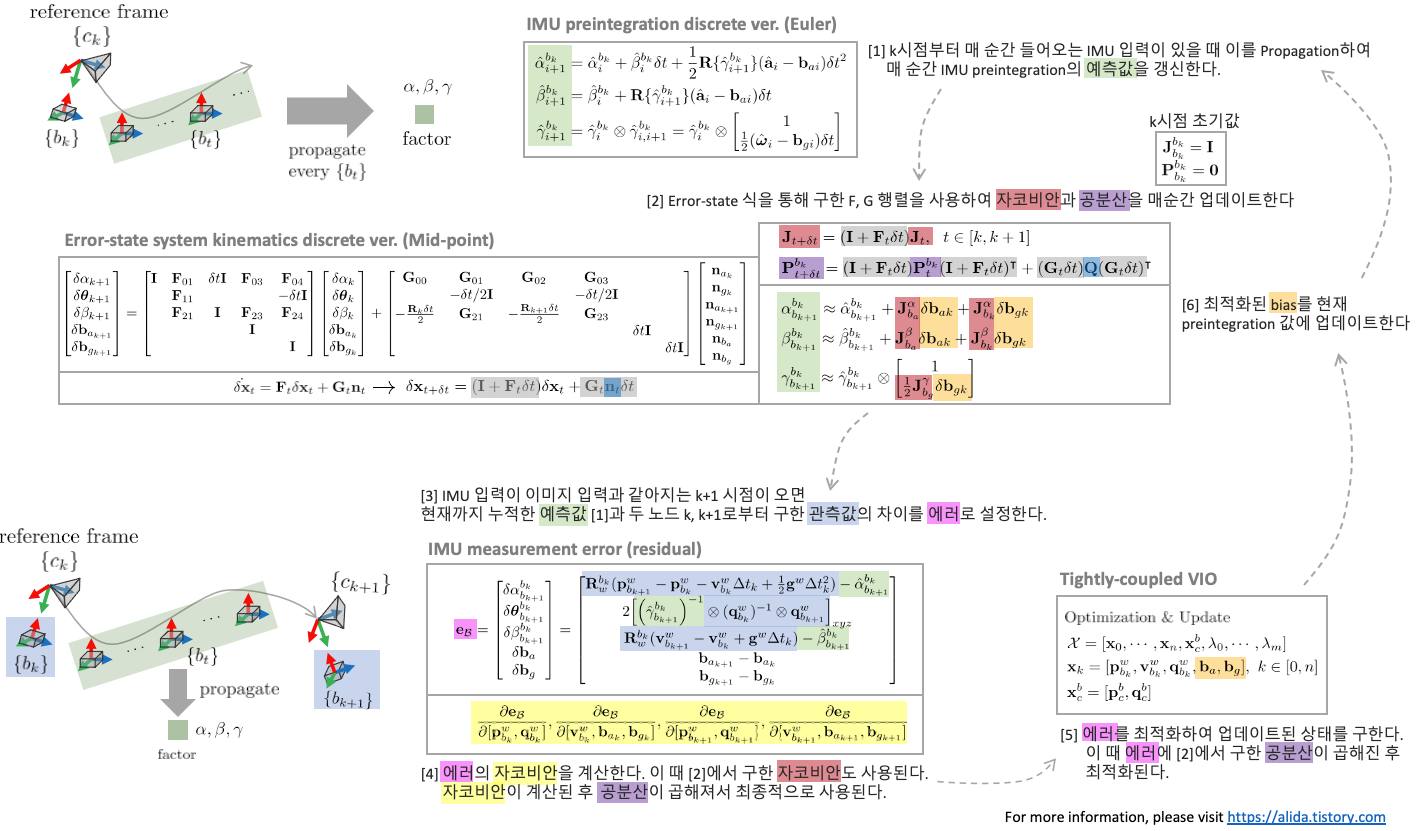 IMU measurement 에러를 구하기 위해서는 우선 IMU preintegration 기법과 error-state 모델링에 대해 알아야 한다. 전반적인 IMU measurement 에러 기반 최적화 과정을 표현한 그림은 위와 같다. [1]-[6] 순서대로 보면 된다. 보다 자세한 내용은 [SLAM] Formula Derivation and Analysis of the VINS-mono 내용 정리를 참조하면 된다.