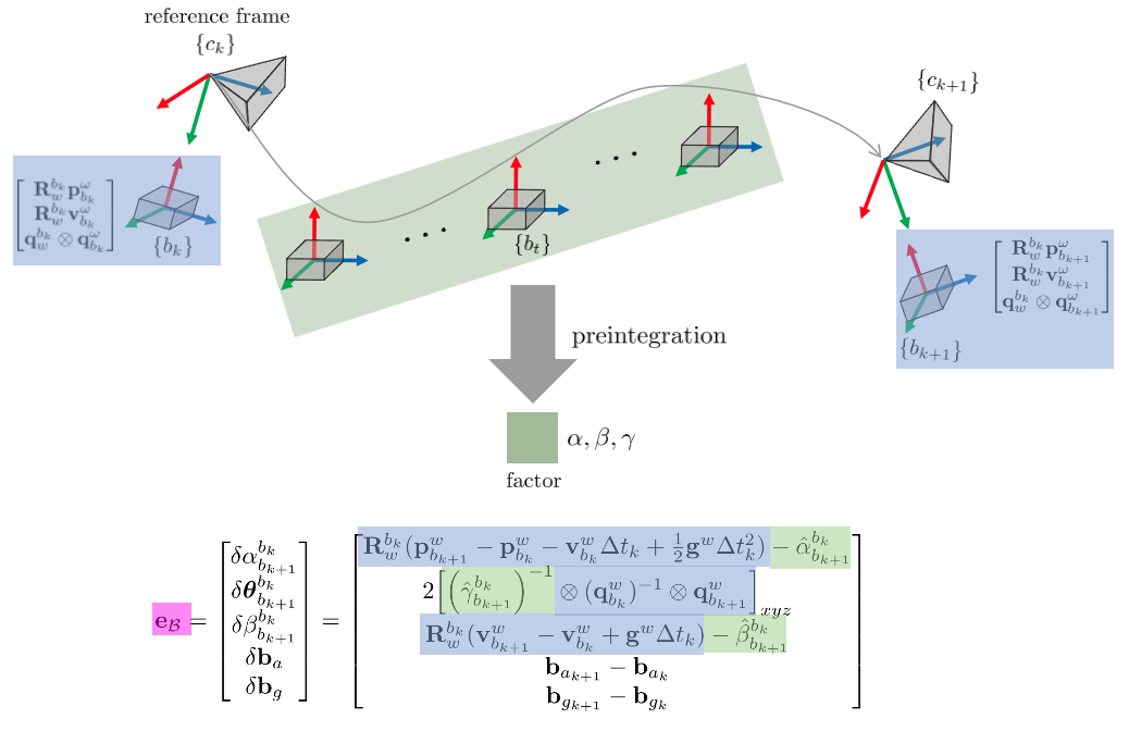 본 섹션에서는 이 중 IMU measurement 에러 $\mathbf{r}_{\mathcal{B}}(\hat{\mathbf{z}}_{b_{k+1}}^{b_{k}}, \mathcal{X})$에 대한 내용만 설명한다.
