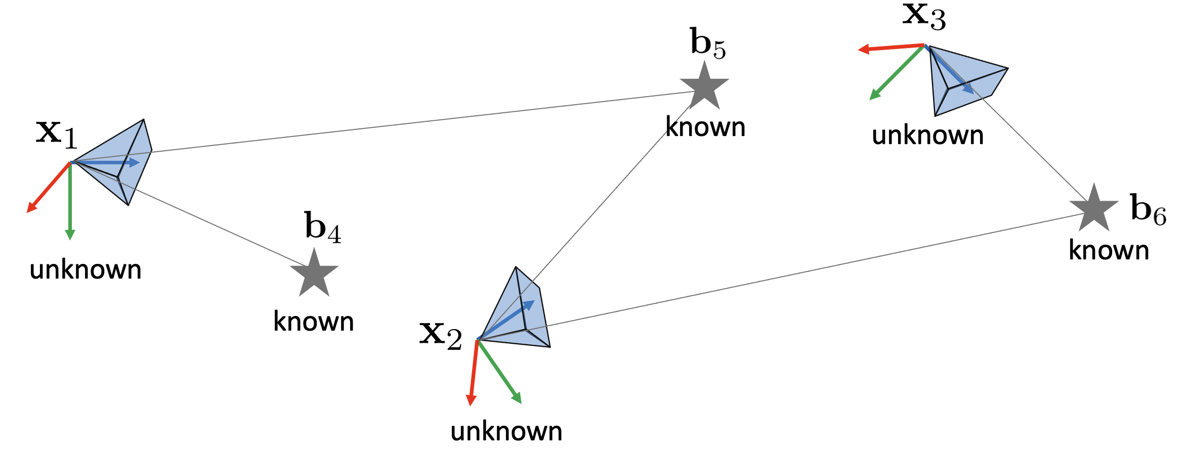 At this time, $\mathbf{x}_{i}, i=1,2,3$ means the pose of the camera in 3D space, and $\mathbf{b}_{i}, i=4,5, 6$ means the coordinates of landmarks.