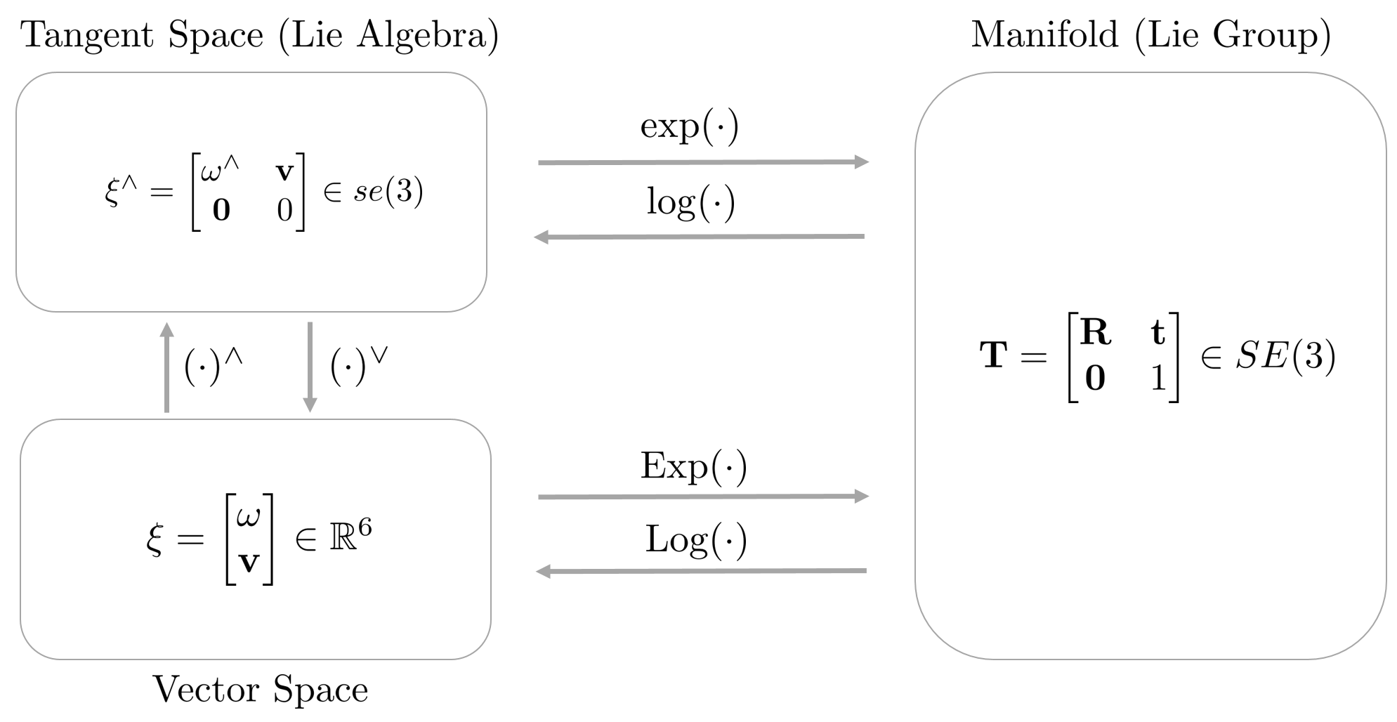 The reason Lie Group and Lie Algebra are important is that 1:1 conversion is possible between the two spaces. Therefore, instead of directly operating in a non-linear manifold space (Lie Group) with complex constraints, a method of performing an operation in a relatively simple linear vector space (Lie Algebra) and then converting it to a manifold space is used. The operations that make this possible are Exponential Mapping and Logarithm Mapping.