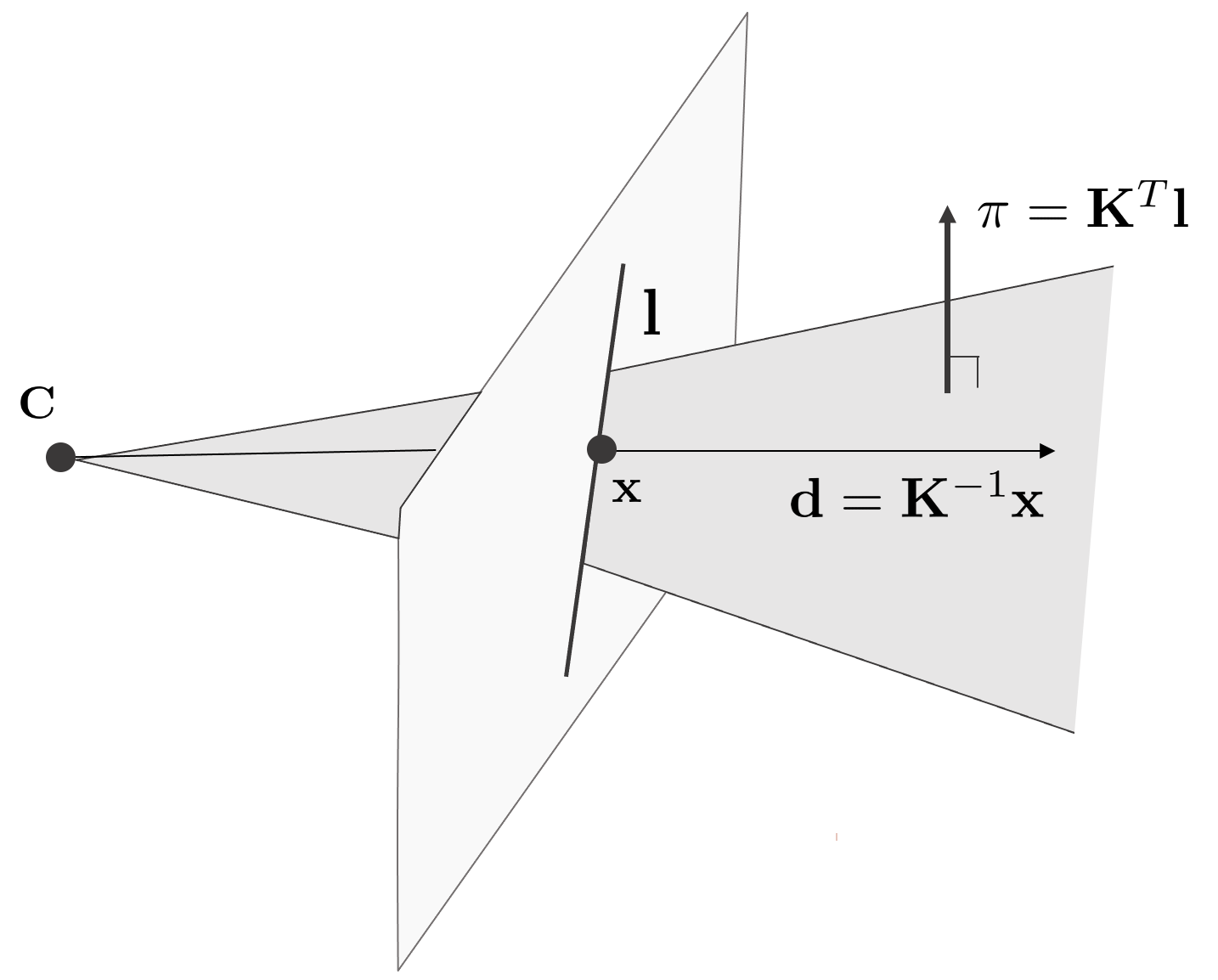 Back-projecting two points $\mathbf{x}_{1}$ and $\mathbf{x}_{2}$ on the image plane gives two straight lines $\mathbf{K}^{-1}\mathbf{x }_{1}, \mathbf{K}^{-1}\mathbf{x}_2$ is created. If the two straight lines are orthogonal, the formula $\mathbf{x}_{1}^{\intercal}\mathbf{w}\mathbf{x}_{2}=0$ holds. And if $\mathbf{x}_{1}$ is included in the straight line $\mathbf{l}$, $\mathbf{x}_{1}^{\intercal}\mathbf{l}=0$ is established.