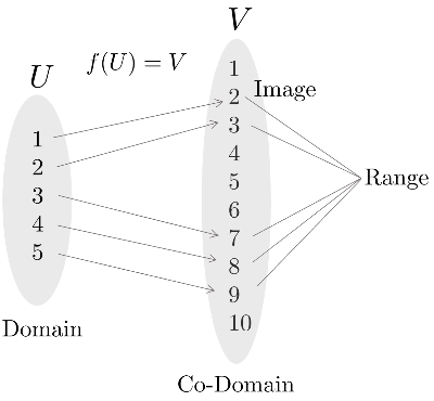 이 때, $U$를 정의역(domain)이라고 부르며 $V$를 공역(co-domain)이라고 한다. 상(image)이란 주어진 입력 $U$에 대해 매핑된 출력 $V$를 의미한다. 치역(range)이란 정의역 내에 있는 입력 $U$들에 의해 매핑된 모든 출력 $V$의 집합을 의미한다.