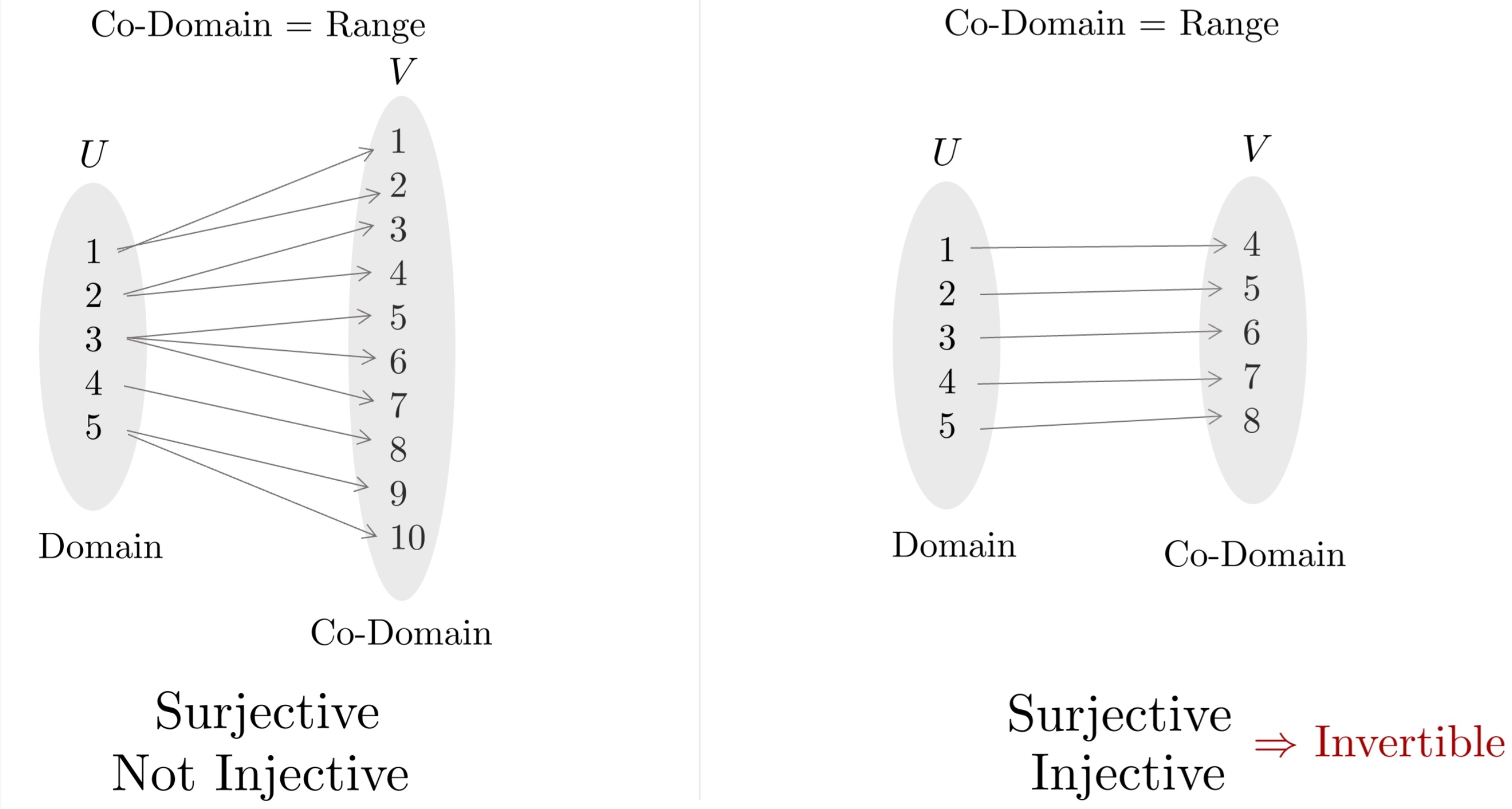 Onto는 전사함수(surjective)라고도 불리며 공역이 치역과 같은 경우를 의미한다. 이는 co-domain의 모든 원소들이 사영된 것을 의미한다. One-to-one은 일대일함수(injective)라고도 불리며 정의역의 원소와 공역의 원소가 하나씩 대응되는 함수를 의미한다. 함수 $f$가 역함수 $f^{-1}$를 가지기 위해서는(invertible) 전사함수이면서 동시에 일대일 함수이어야 한다.