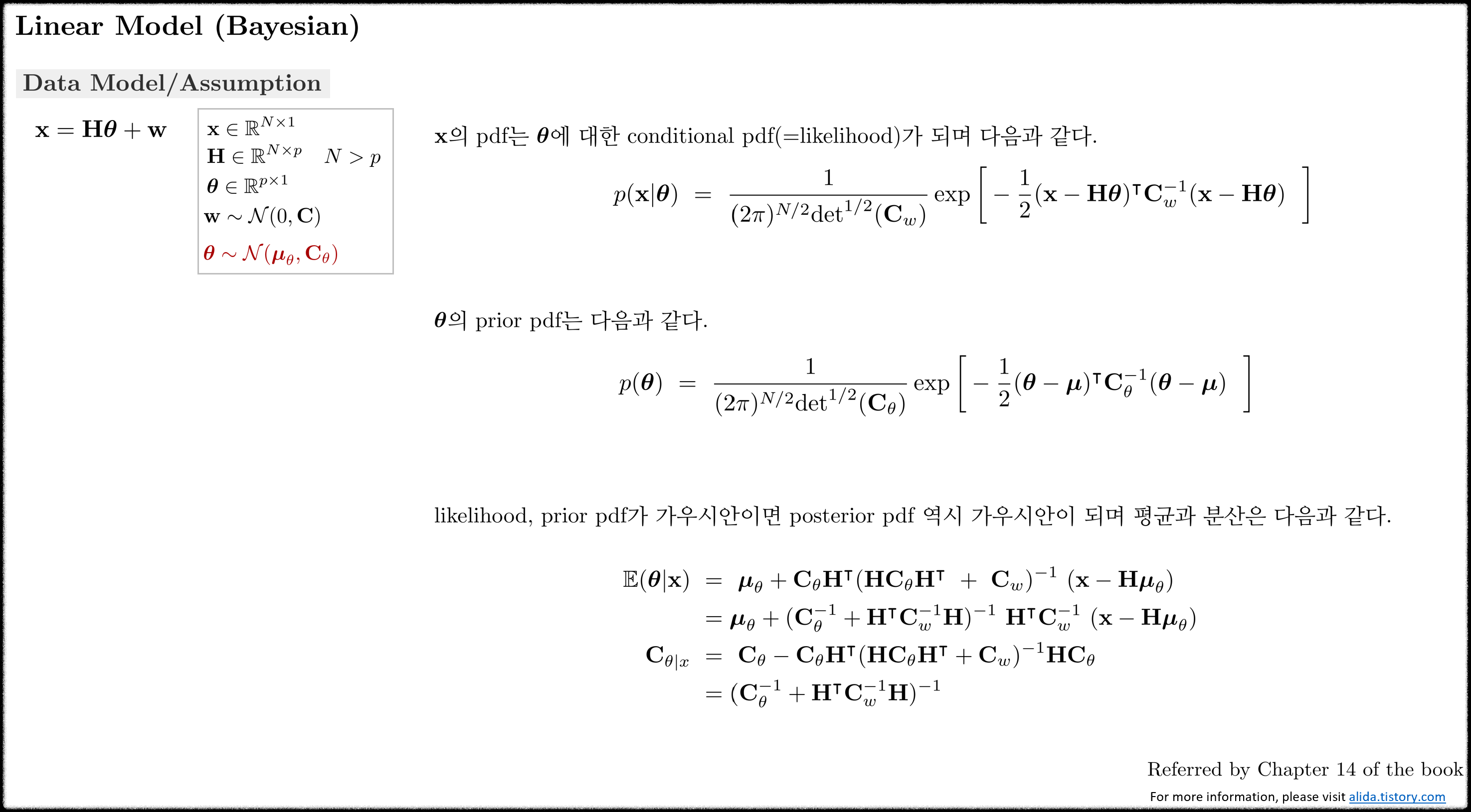 행렬 $\mathbf{H}$는 $N\times2$의 크기를 가지며 일반적으로 관측 함수(observation matrix)라고 부른다. 데이터 $\mathbf{x}$는 파라미터 $\boldsymbol{\theta}$가 관측 행렬 $\mathbf{H}$를 통과한 다음에 관측되기 때문이다. 노이즈 벡터도 $\mathbf{w} \sim \mathcal{N}(\mathbf{0}, \sigma^2 \mathbf{I})$와 같이 벡터 형태로 나타낼 수 있다. 이러한 (\ref{eq:lm1})의 형태를 선형 모델(liinear model)이라고 부른다. 선형모델의 노이즈는 일반적으로 가우시안 형태를 가진다.