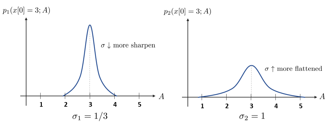 $\sigma_{1}^2 < \sigma_{2}^2$이므로 우리는 $p_{1}(\cdot)$이 $A$를 더 잘 추정하고 있다고 판단할 수 있다. 예를 들어 $A=4.5$일 확률은 $p_{1}$보다 $p_{2}$가 더 높으므로 우리는 $p_{1}$이 더 좁은 범위에 대한 확실한 확률분포를 가짐을 알 수 있다.