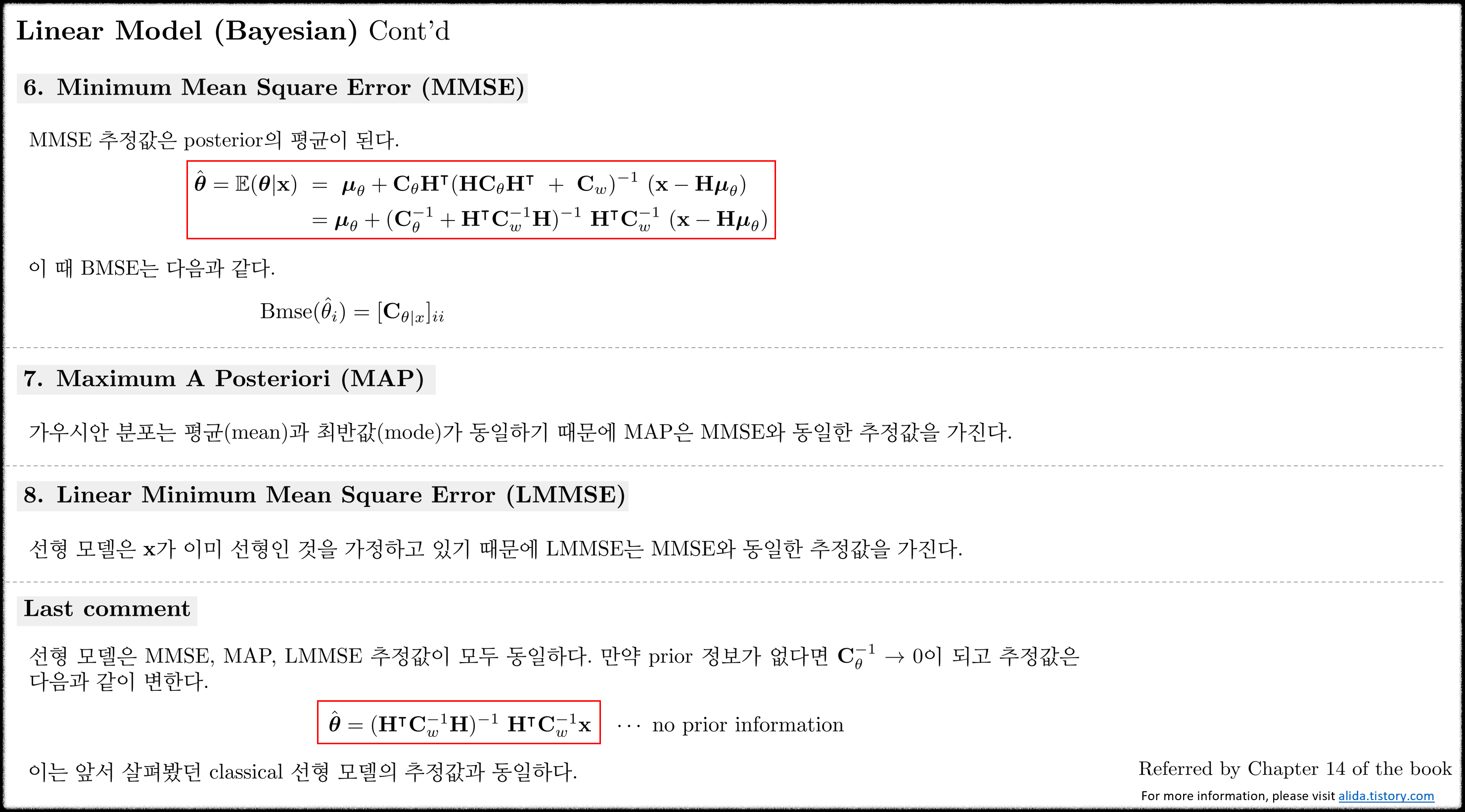 3) 이는 추정값이 선형이어야 하는 제약조건을 가진다. 이는 때때로 강력한 제약조건이지만 최적의 선형 추정값을 구할 수 있다.