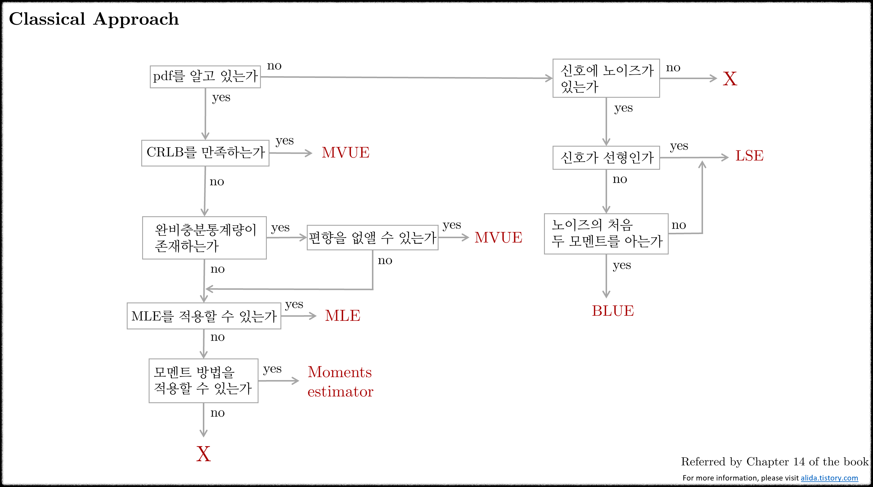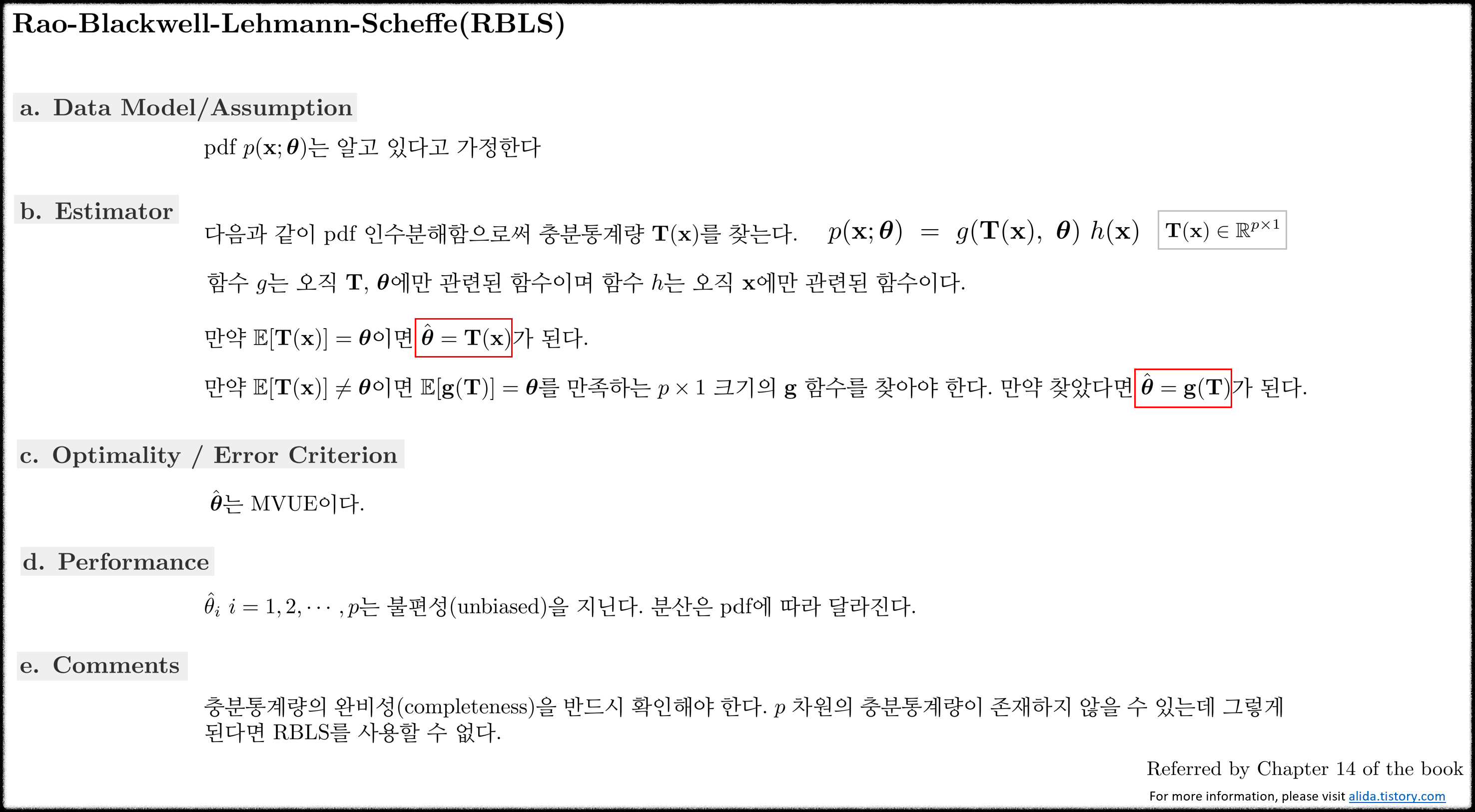 1,2) CRLB는 임의의 불편추정값에 대하여 분산의 하한선(lower bound)를 결정하게 해준다. 만약 어떤 추정값이 CRLB와 동일한 분산 값을 가진다면 이는 반드시 MVUE가 된다. CRLB와 동일한 분산 값을 가지지 않는다고 하더라도 MVUE가 존재할 수 있다. 이럴 때는 RBLS를 적용한다. RBLS는 충분통계량(sufficient statistics)을 먼저 구한 후 충분통계량에 대한 추정을 수행하는데 이 때 추정값이 $\theta$에 대한 불편추정값이 된다.