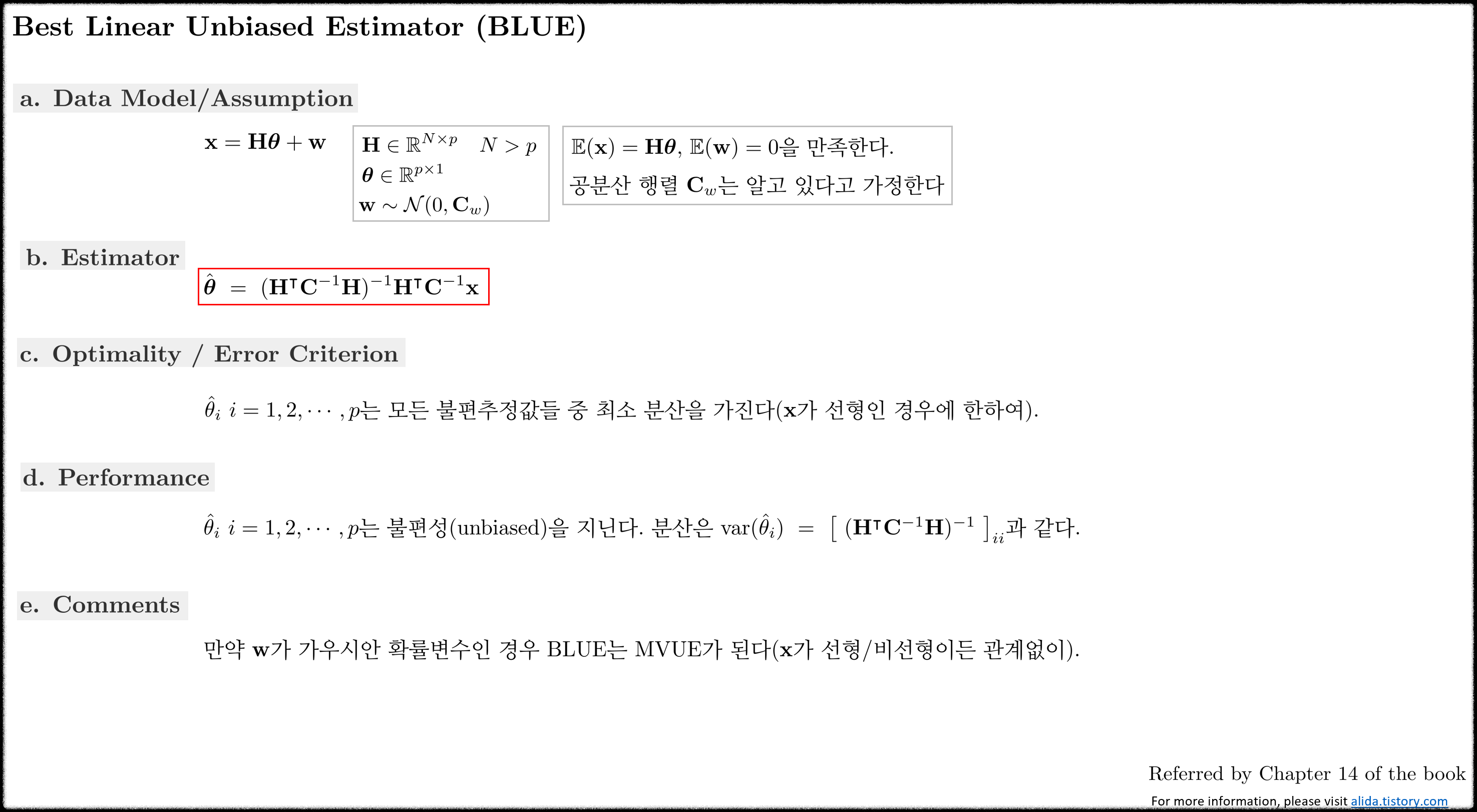 추정값이 불편성(unbiased) 뿐만아니라 선형(linear) 특성이 있다는 제약조건 하에 분산을 최소화하는 MVUE를 구한다.