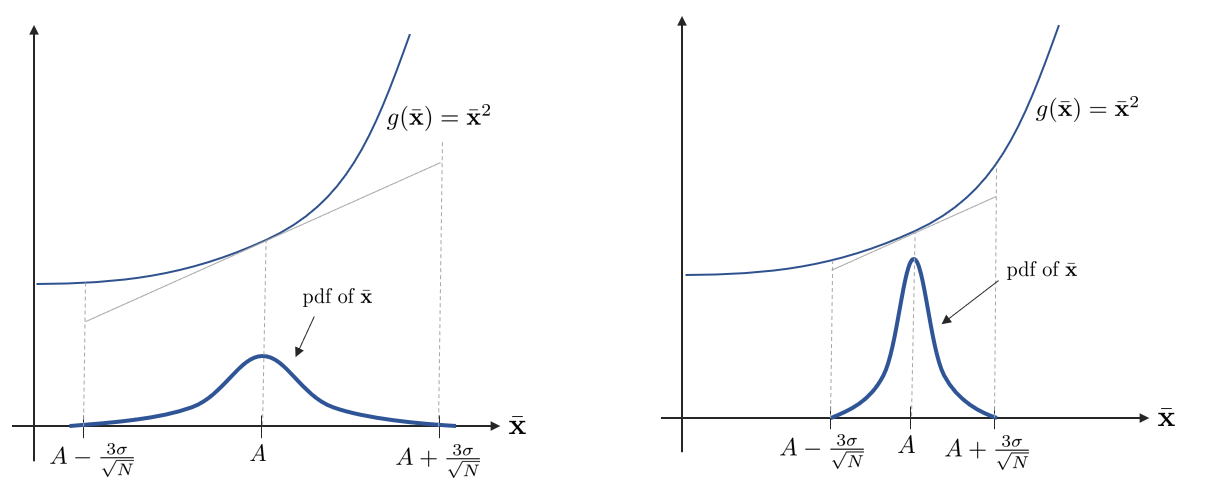 앞서 보았듯이 efficiency는 linear 또는 affine 변환에서만 보존되는 것을 확인하였다. 하지만 데이터가 충분히 큰 경우에는 비선형 변환도 근사적으로(approximately) efficiency가 보존된다. 다시 이전 예제 $\alpha = g(A) = A^{2}$로 돌아가서 데이터 $x[n]$의 평균을 $\bar{x} = \frac{1}{N} \sum_{n=0}^{N-1} x[n]$이라고 할 때 $\bar{x}^{2}$는 $N$이 충분히 클 경우 근사적으로 편향이 제거된다.