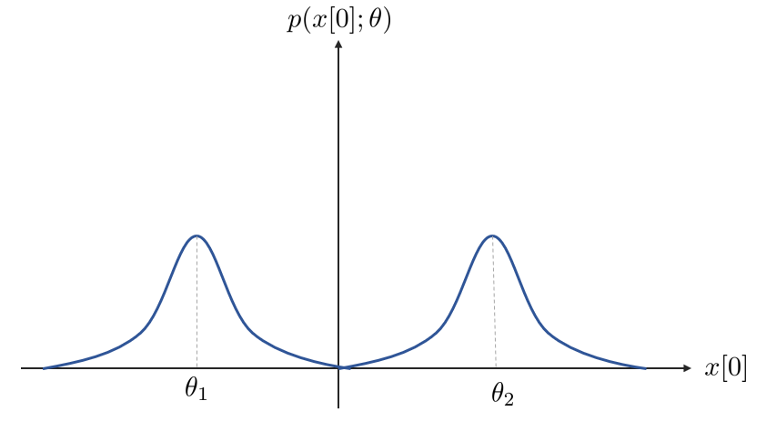 예를 들면 아래와 같은 그림이 주어졌다고 했을 때 $x[0]$ 값이 음수가 관측되면 우리는 $\theta=\theta_{2}$보다는 $\theta=\theta_1$이라고 일반적으로 유추할 수 있다. 하지만 실제 문제에서는 위와 같은 pdf는 주어지지 않기 때문에 데이터 $x$와 파라미터 $\theta$의 관계를 정의해야 한다.