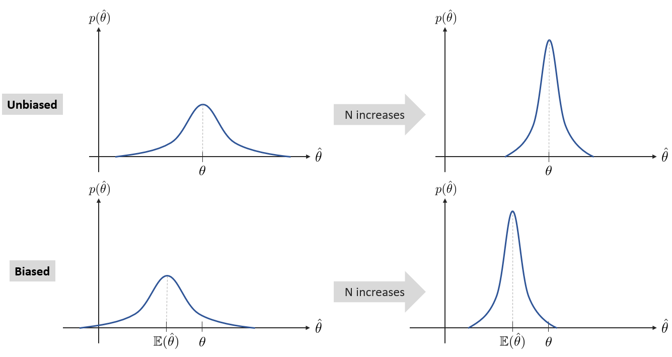 따라서 위 식에서 보다시피 많은 수($n \uparrow$)의 추정값을 사용할 수록 분산은 작아진다. 만약 $n \rightarrow \infty$이면 분산은 0이 되고 $\hat{\theta} \rightarrow \theta$가 된다. 하지만 편의추정량의 경우 $\mathbb{E}(\hat{\theta}_{i}) = \theta + b(\theta)$이므로 다음과 같은 기대값을 가진다.