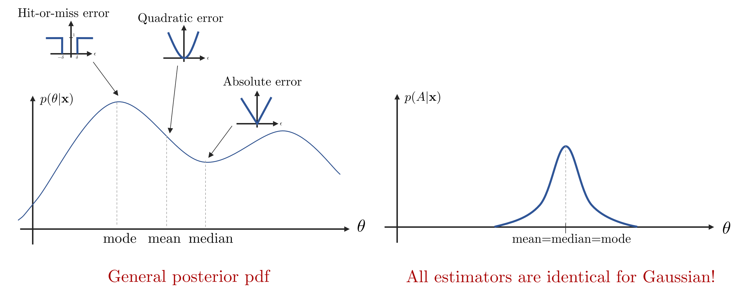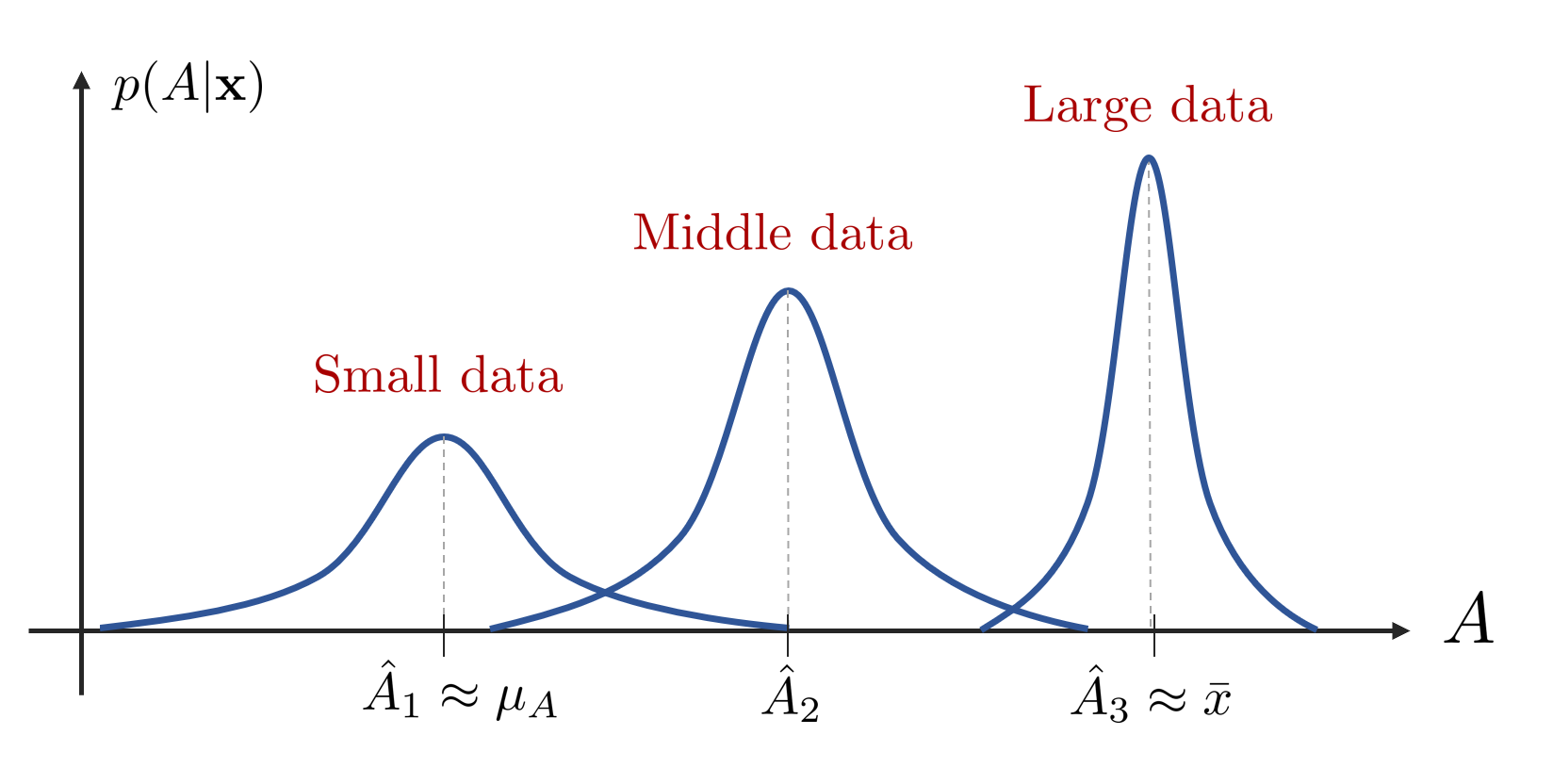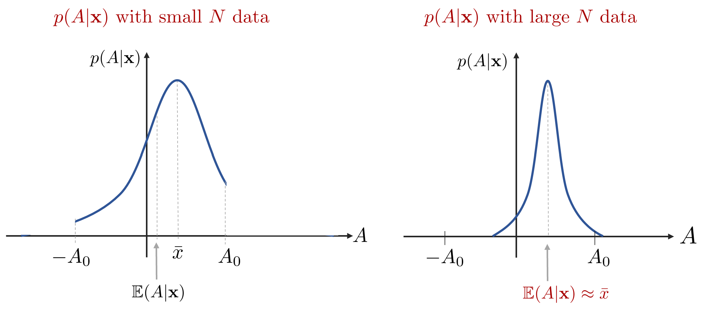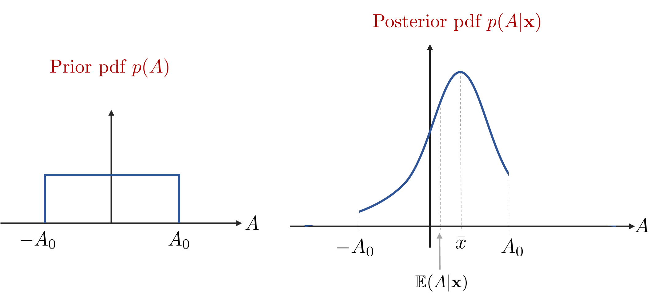 따라서 BMSE에 대한 최적의 추정값 $\hat{A}$는 posterior pdf $p(A|\mathbf{x})$의 기대값인 것을 알 수 있으며 이를 MMSE(minimum MSE) 추정값이라고 부른다. Posterior pdf는 데이터 $\mathbf{x}$가 관찰되었을 때 파라미터 $A$의 pdf를 의미한다. 이와 대조적으로 prior pdf $p(A)$는 데이터가 관측되기 전 $A$의 pdf를 의미한다. 직관적으로 이해하자면 데이터를 관측하는 행동이 $A$의 pdf를 뾰족하게 만드는 효과를 가진다. 이는 데이터에 대한 지식이 $A$의 불확실성을 줄여주기 때문이다.