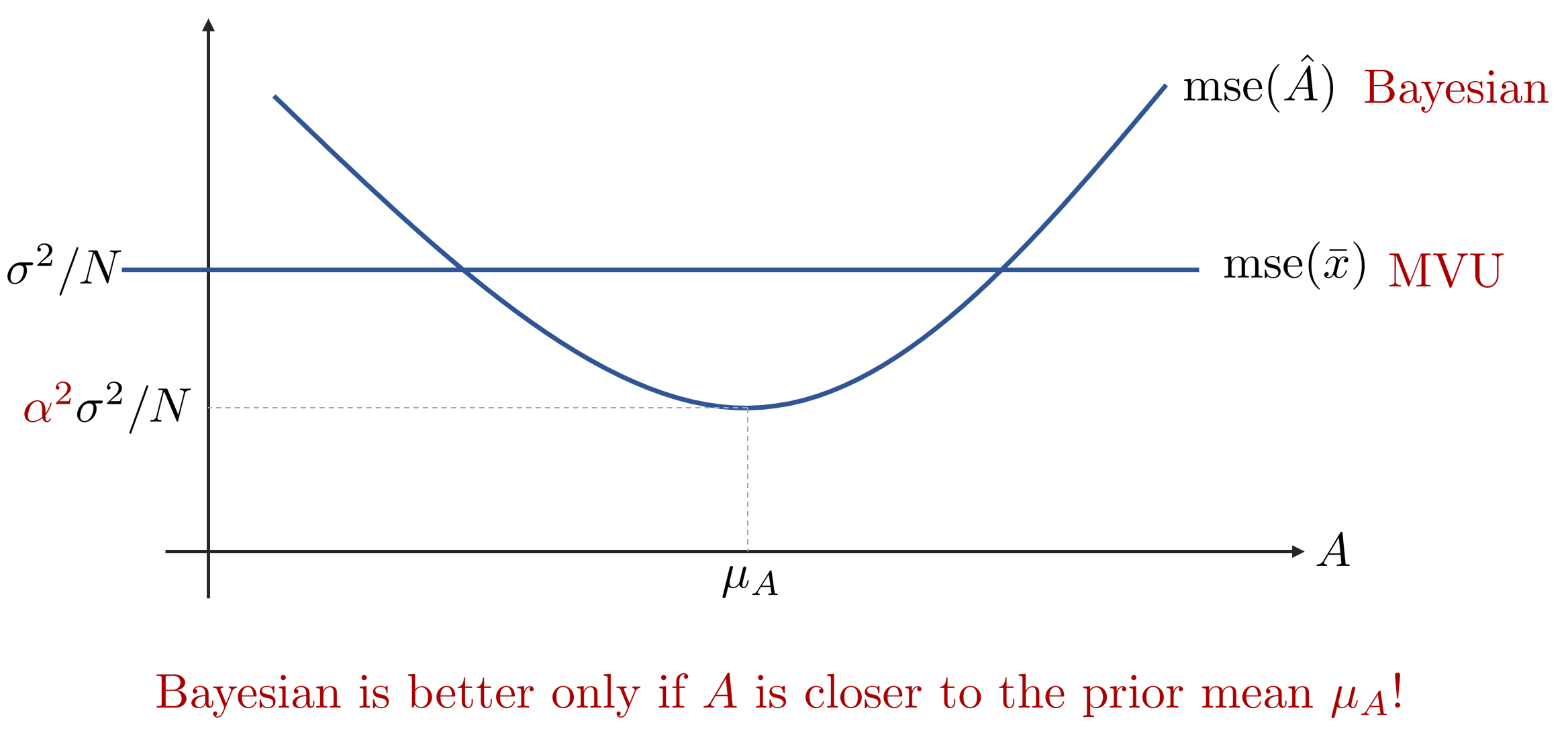- Bayesian 추정은 MVUE를 찾는 것이 불가능한 경우 사용하기 좋은 방법이다. 예를 들어 특정 불편추정값(unbiased estimator)의 분산이 다른 불편추정값들의 분산보다 일관되게 작지 않은 경우를 생각해보자. 이런 경우 고전적인 방법으로는 MVUE를 찾는 것이 불가능하므로 파라미터 $\theta$에 pdf를 적용함으로써 우리는 그 추정값 $\hat{\theta}$을 찾는 방법을 생각할 수 있다. $\hat{\theta}$가 다른 추정값들보다 평균제곱오차(MSE)가 작다면 이는 최적의 추정값이라고 결론지을 수 있다. 즉, 파라미터 $\theta$에 대한 확률적인 가정을 함으로써 차선의 추정값을 찾을 수 있는데 이러한 관점이 Bayesian 관점이다.