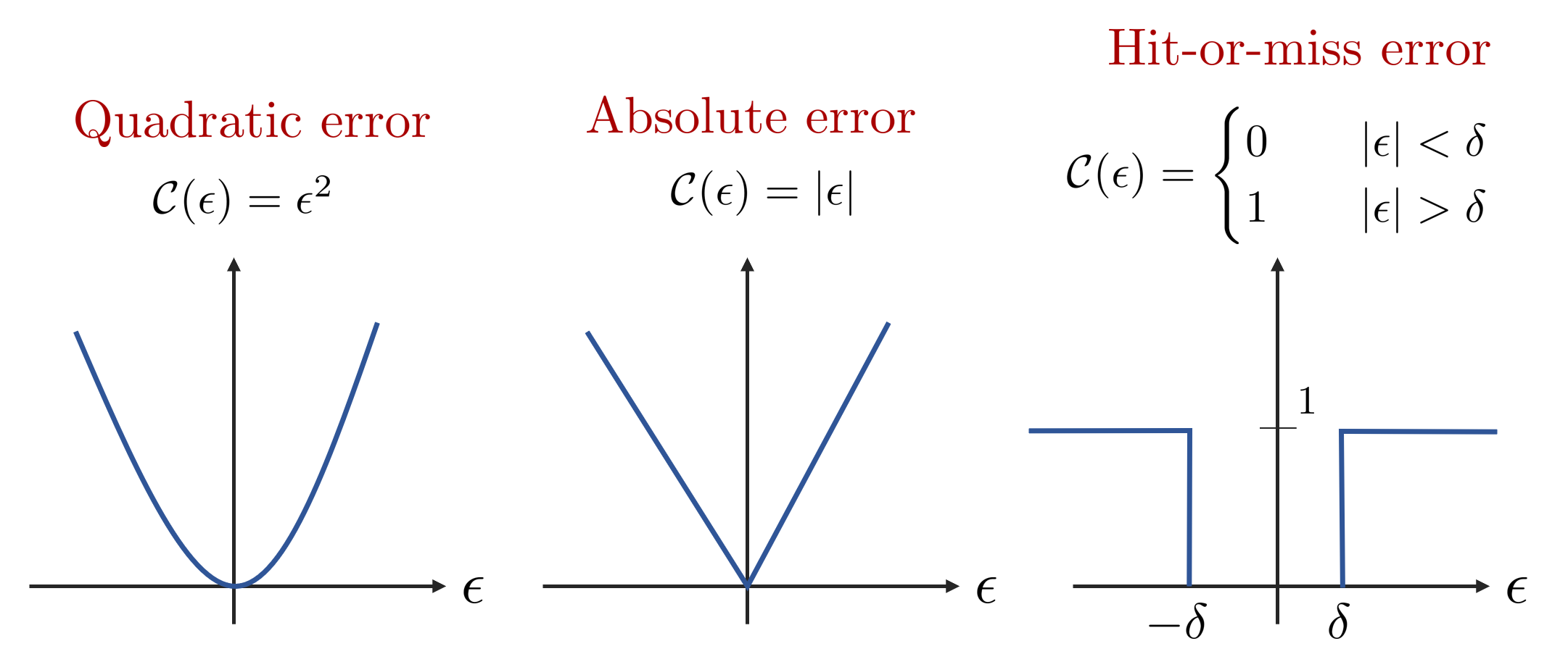 두 관점 모두 궁극적으로는 파라미터 $A$에 대한 최적의 추정값 $\hat{A}$을 얻는 것이 목표이지만 베이지안 추정 관점에서 봤을 때 $A$에 대한 사전 정보(prior knowledge)를 확인할 수 있게 되었다. 예를 들어 우리는 Bayesian MSE(=BMSE)를 최소화시키는 추정값 $\hat{A}$를 찾을 수 있다. BMSE는 다음과 같이 정의된다.