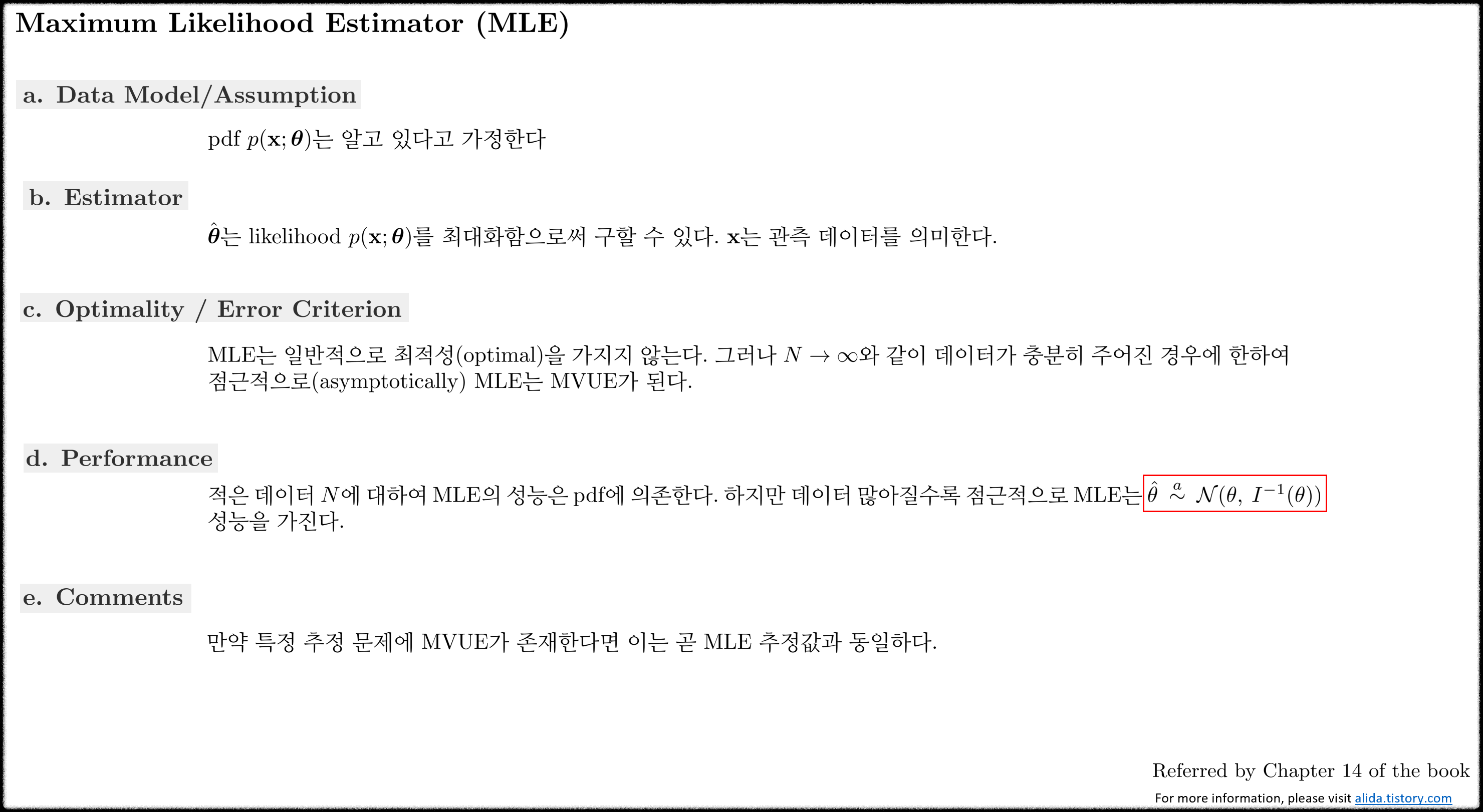 - 고전적인 추정 방법 : 파라미터 $\theta$를 미지의 결정론적(deterministic) 파라미터로 보는 빈도주의(frequentist) 관점으로 해석